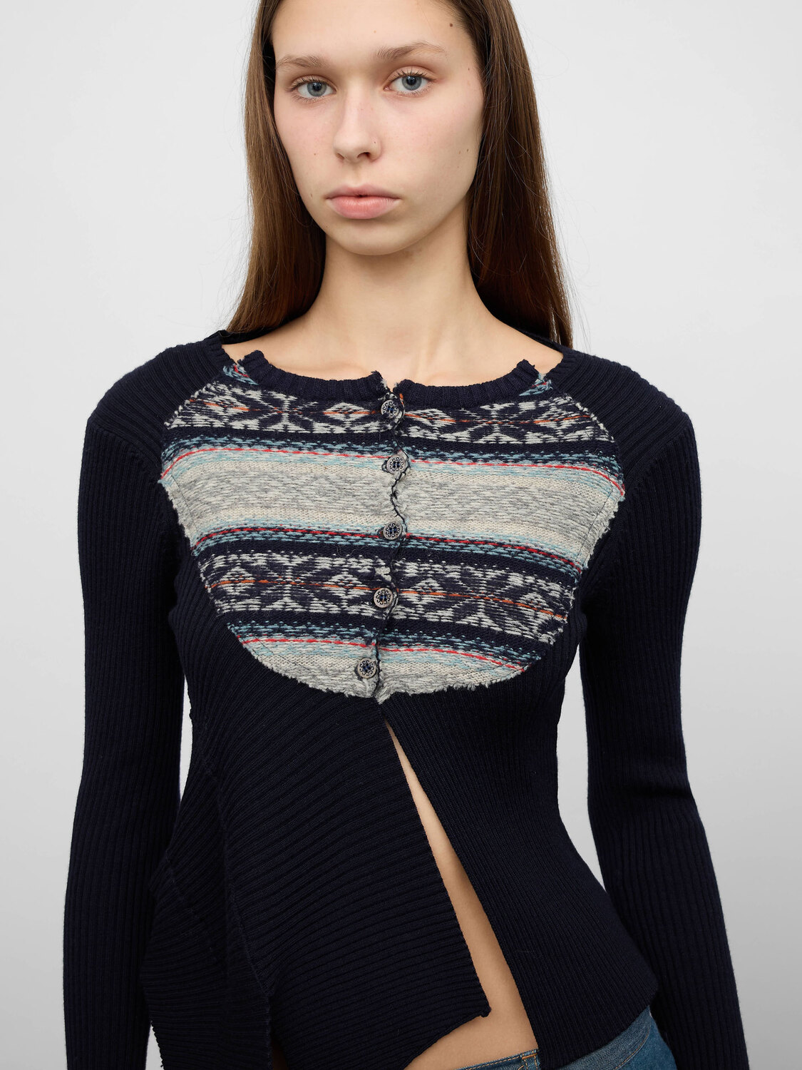 Marithé+François Girbaud black wool knitted cardigan with a large pattern patchwork detail in the middle and an asymmetrical hem.