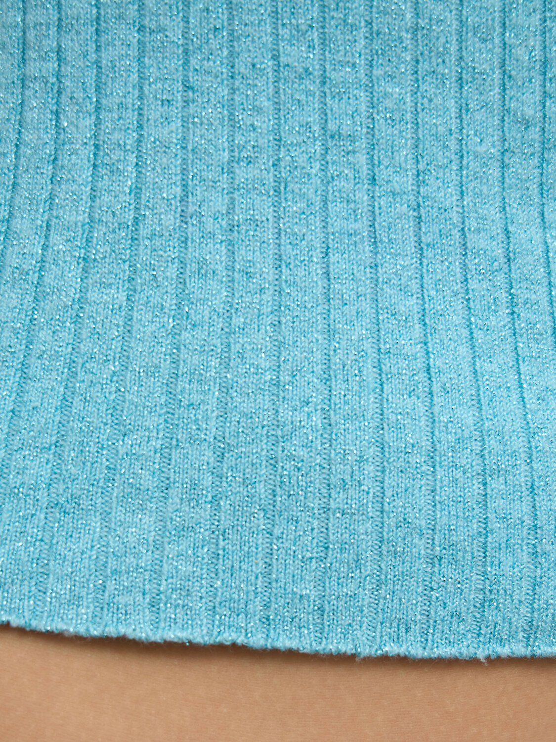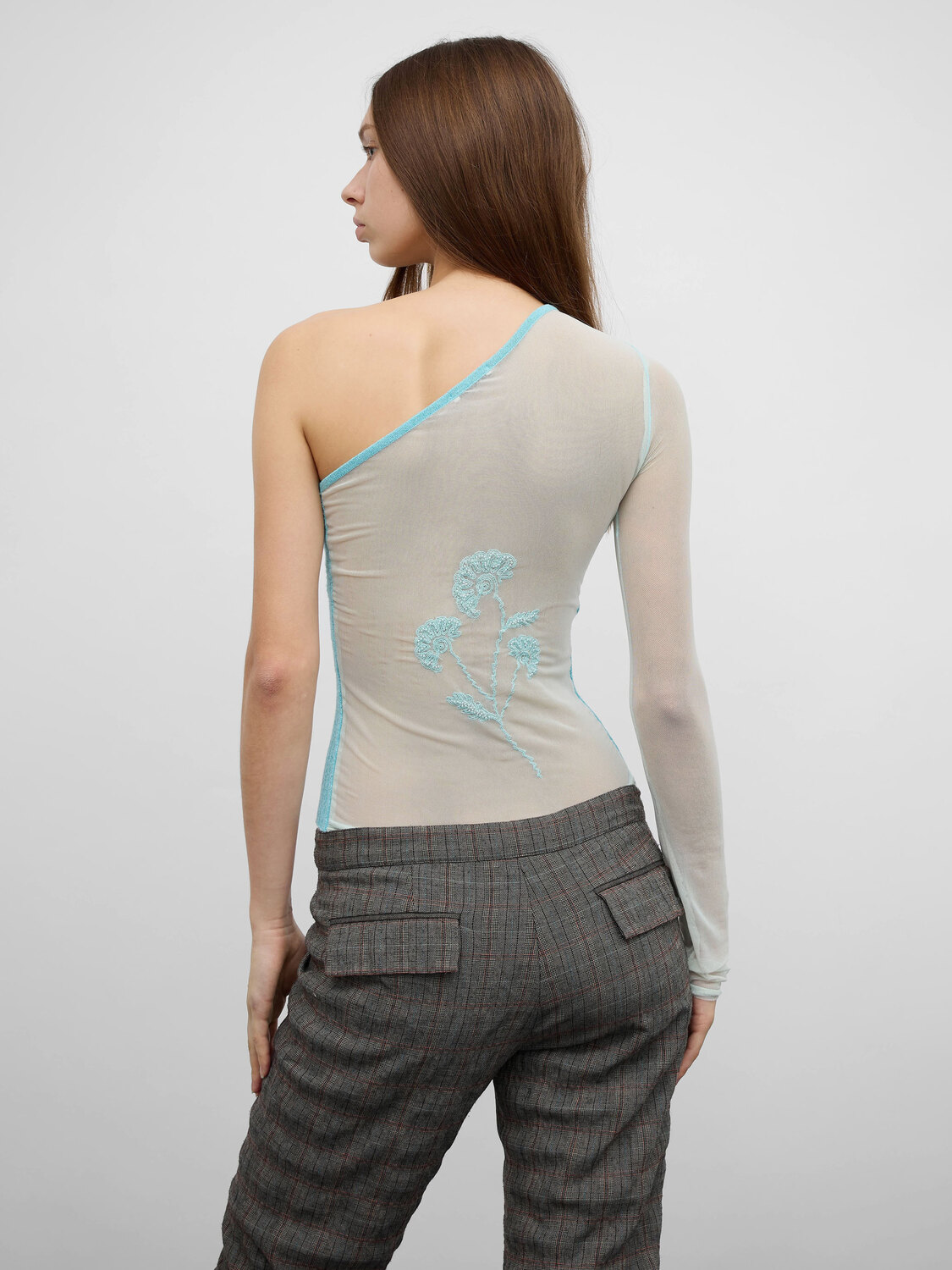 Baby blue rib-knit lurex one-shoulder top with mesh sleeve and mesh back featuring floral embroidery embellished with small pearlescent beads.