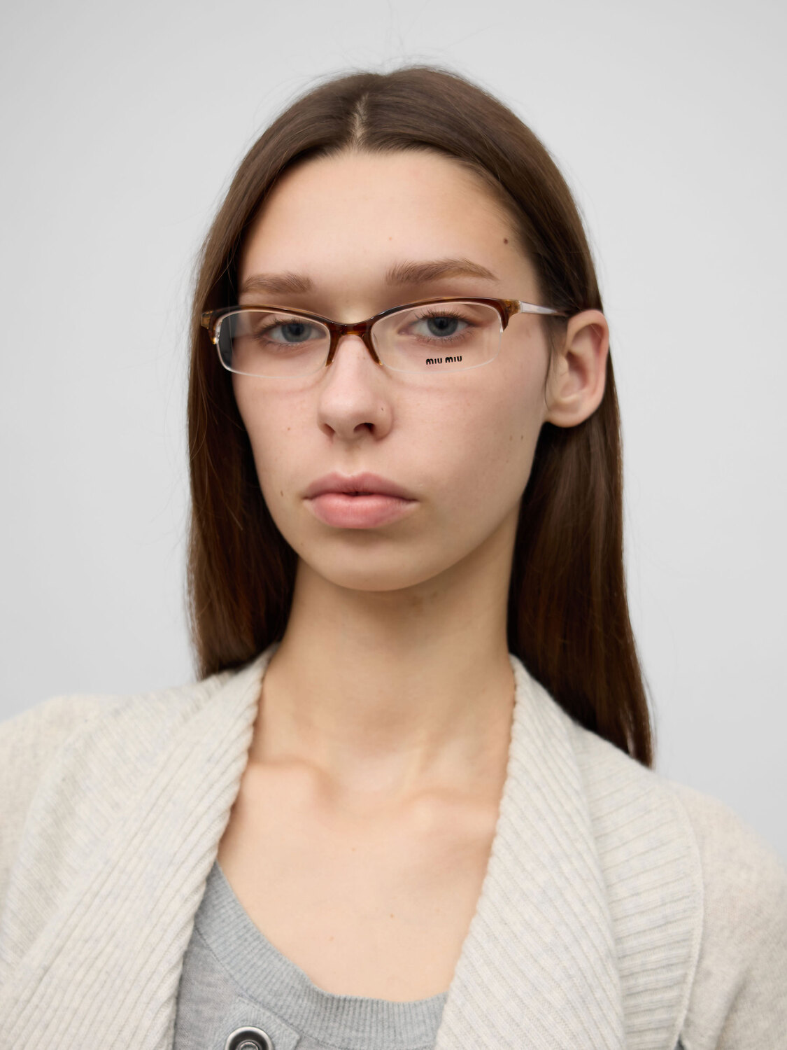 Miu Miu glasses with rectangular lenses in a brown semi-rimless polycarbonate frame. Temples with engraved logo on each site.