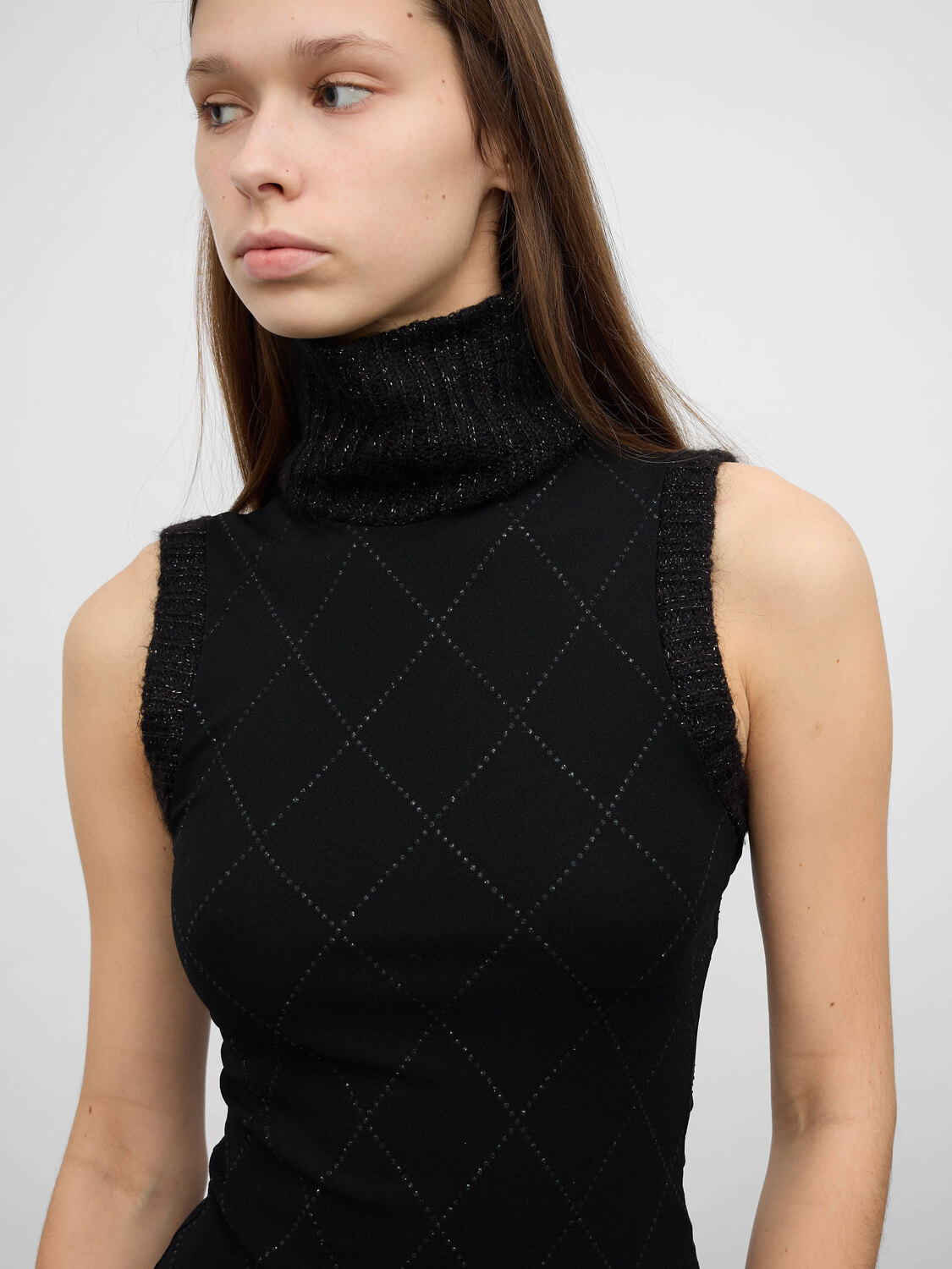 Morgan de Toi black stretchy mesh vest with argyle pattern rhinestone embellishment and knitted turtleneck.