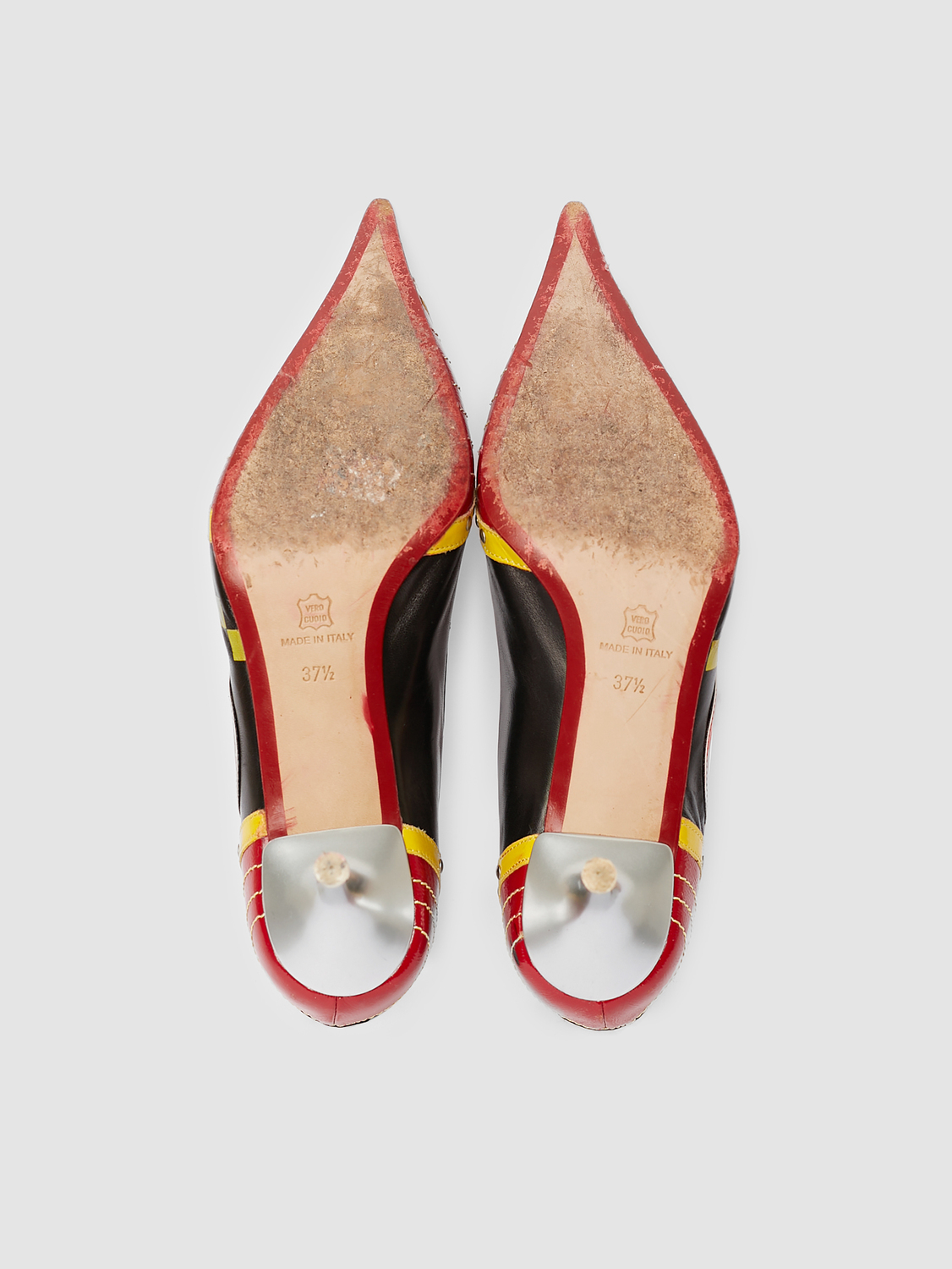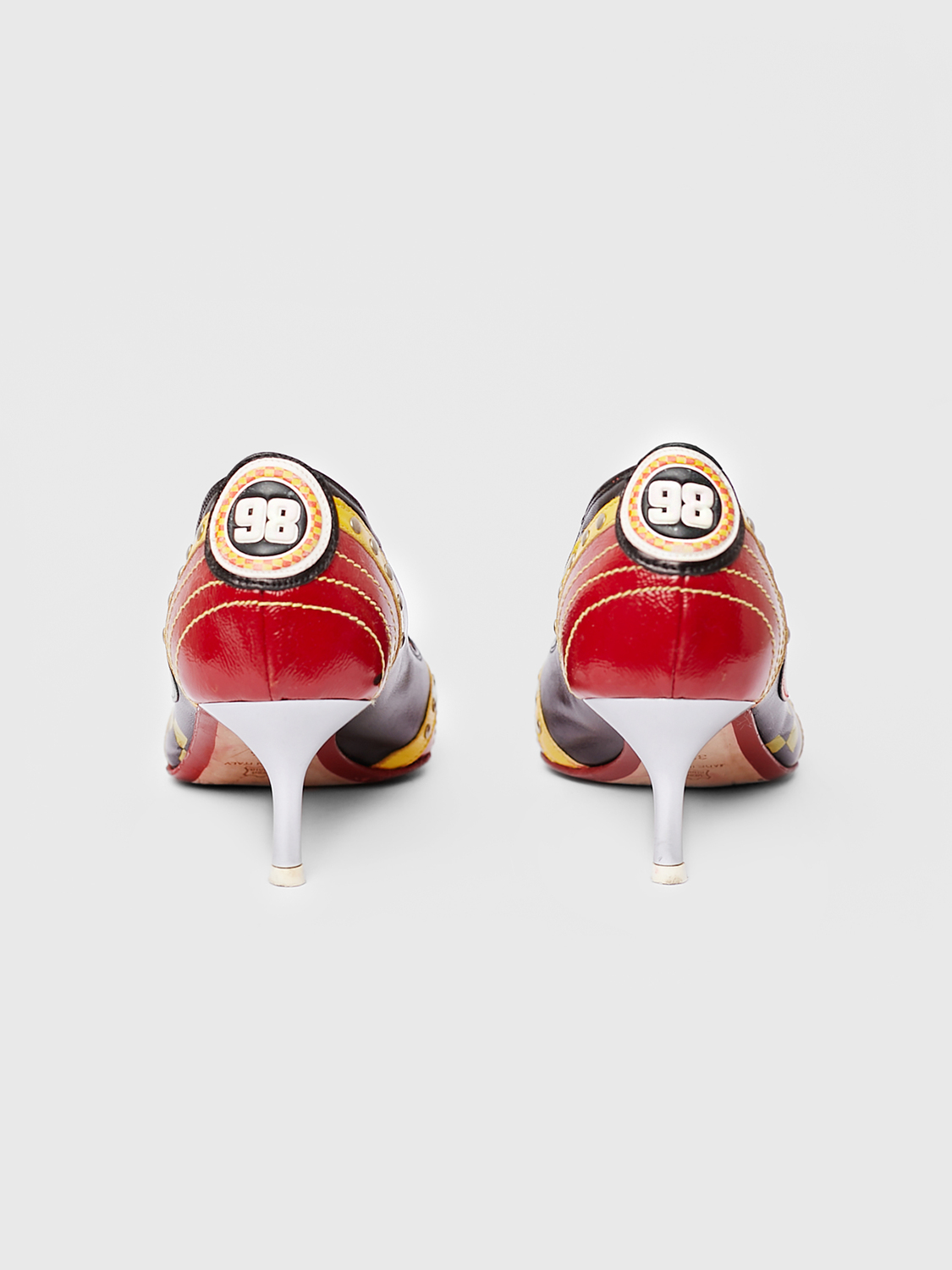 Multicolour leather pointed toe racing themed heels with decorative silver-tone metal zippers and studs, yellow stitching accents and race car decal patches.