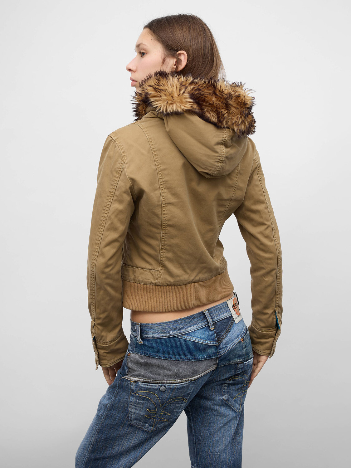 Nolita brown double-layer jacket featuring zip and button closure, faux fur lined hood, brass and silver-tone hardware, integrated drawstrings at the waist.