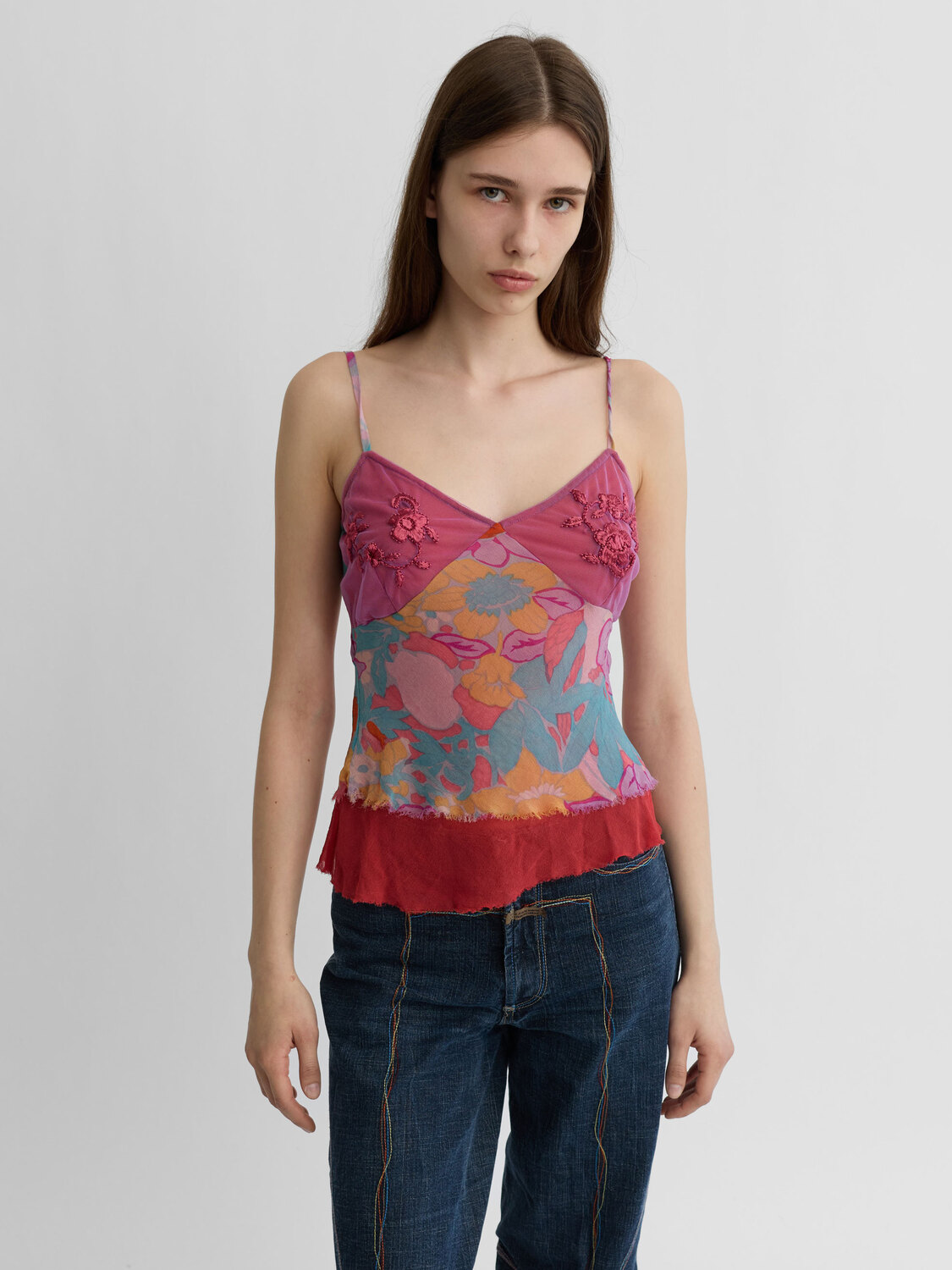 Nolita multicolour silk camisole top featuring a floral print, nylon bust with embroideries and asymmetrical raw hems.
