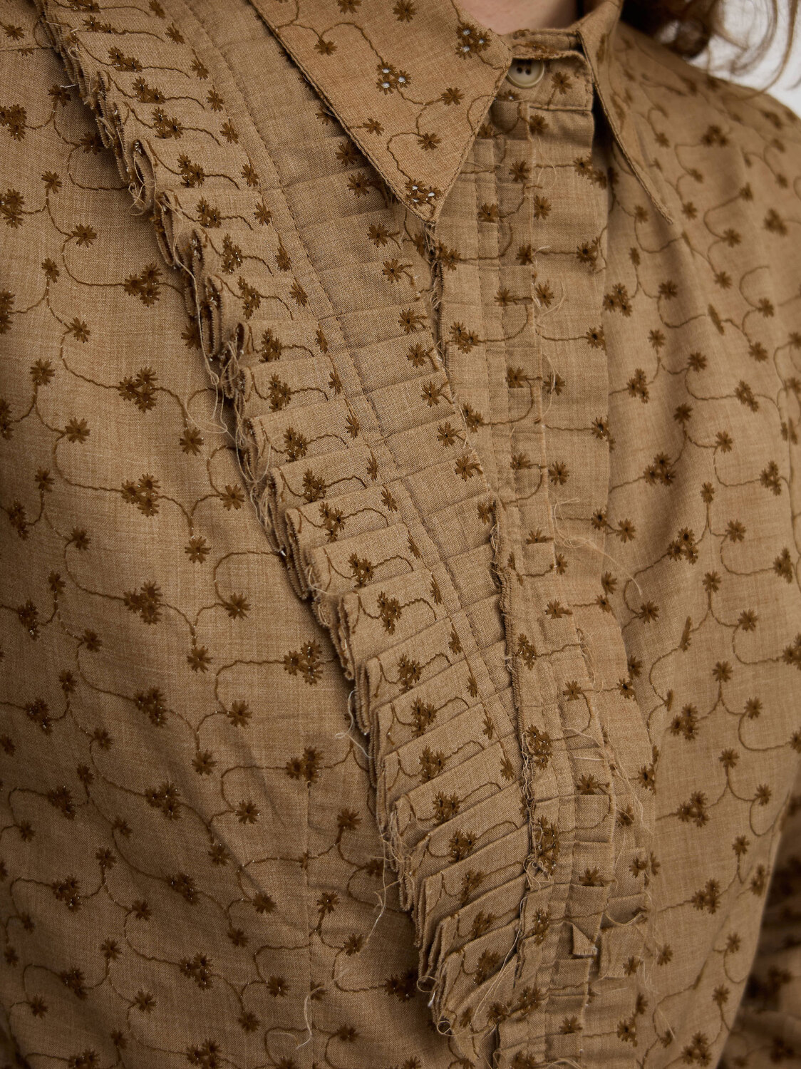 Plein Sud brown broderie anglaise embroidered shirt with pleated details.