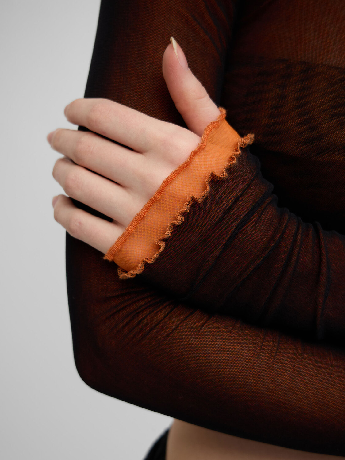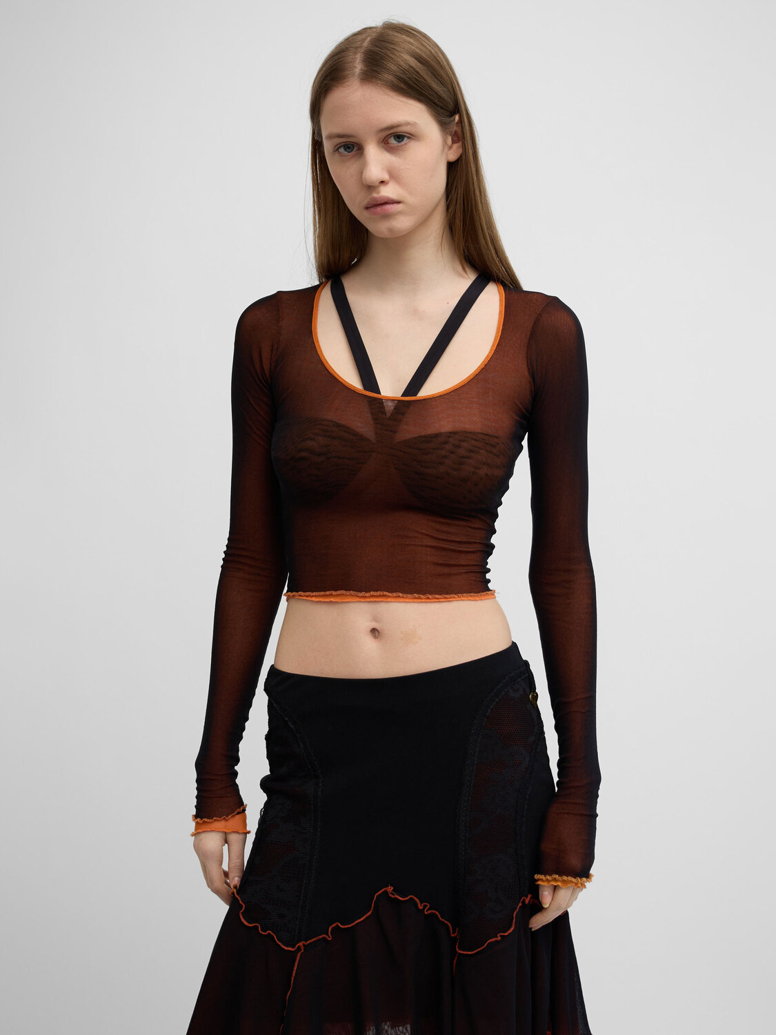 Plein Sud Jeans black and orange double layer mesh top with lettuce hem.