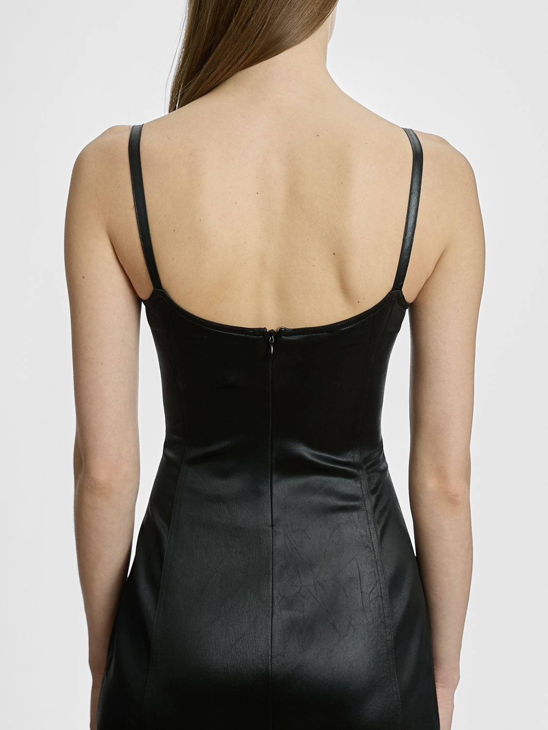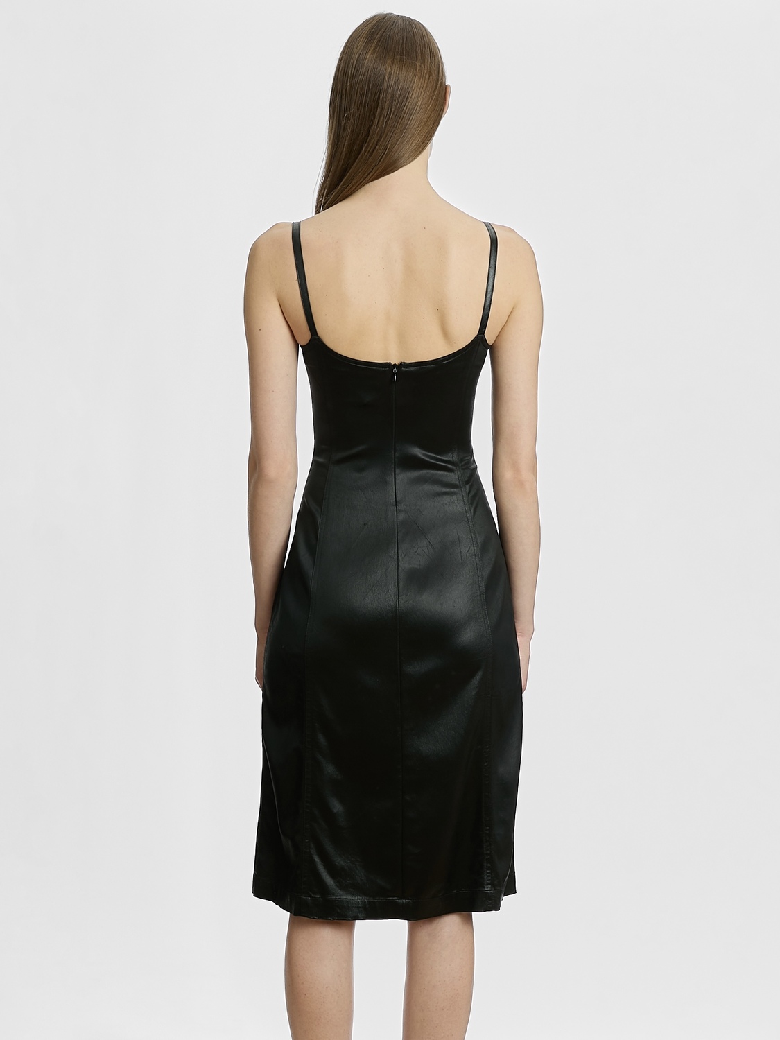 Plein Sud (Jeans line) black crushed satin bustier midi dress with adjustable shoulder straps and concealed zipper closure at the back.