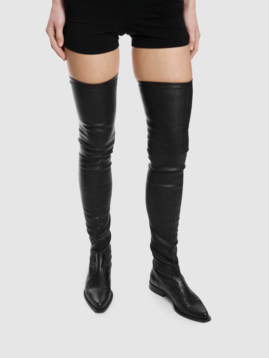 Plein Sud black leather thigh-high stocking boots with pointed toe.
