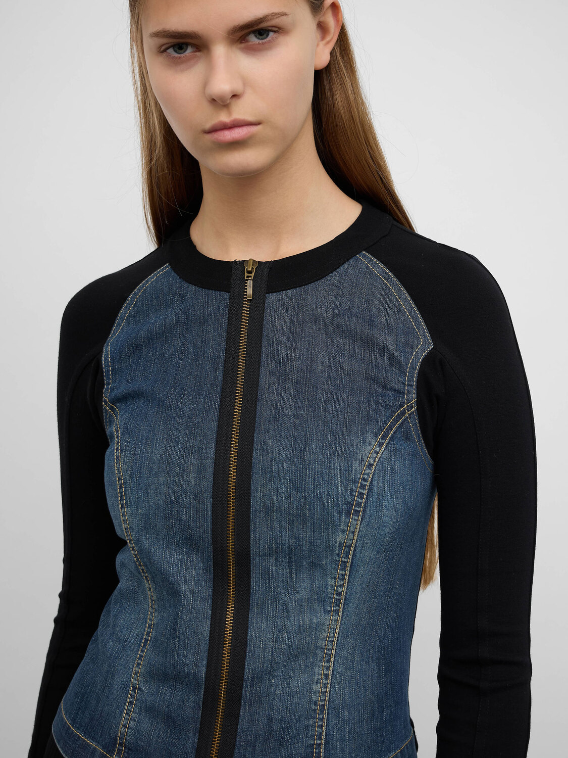 Plein Sud black jersey zip-up jacket with blue denim front.
