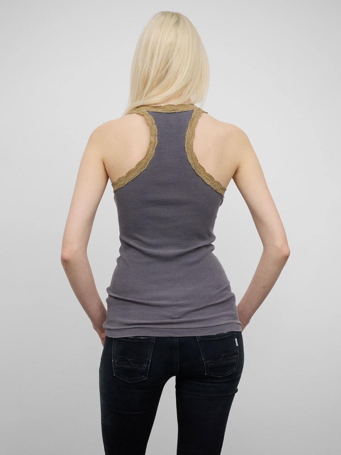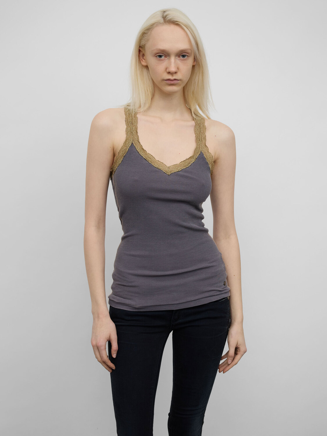 Violet grey stretchy rib cotton tank top with beige lace trim.