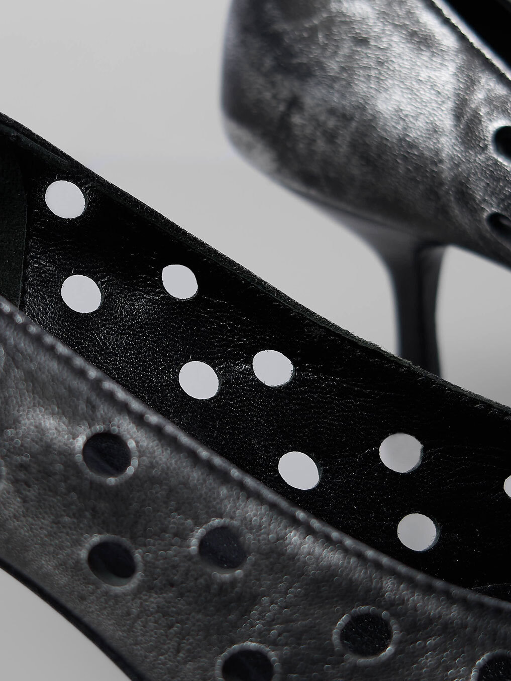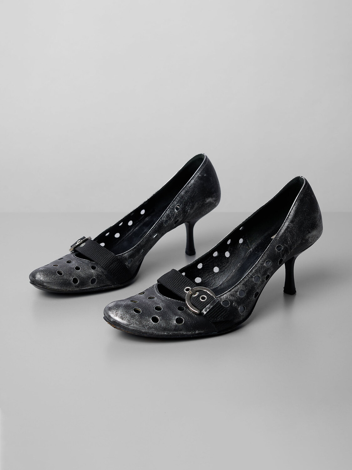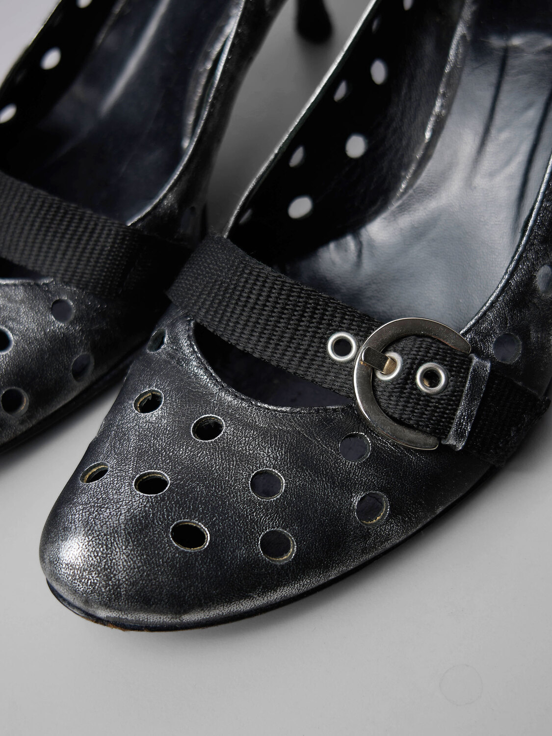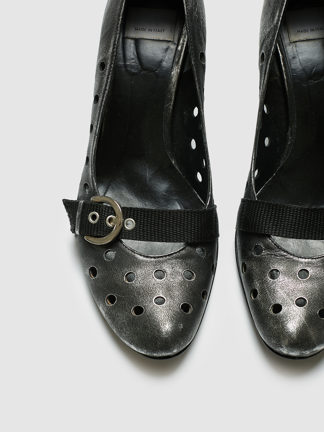 Silver-grey leather perforated heels with black utility style straps and silver-tone metal buckles.