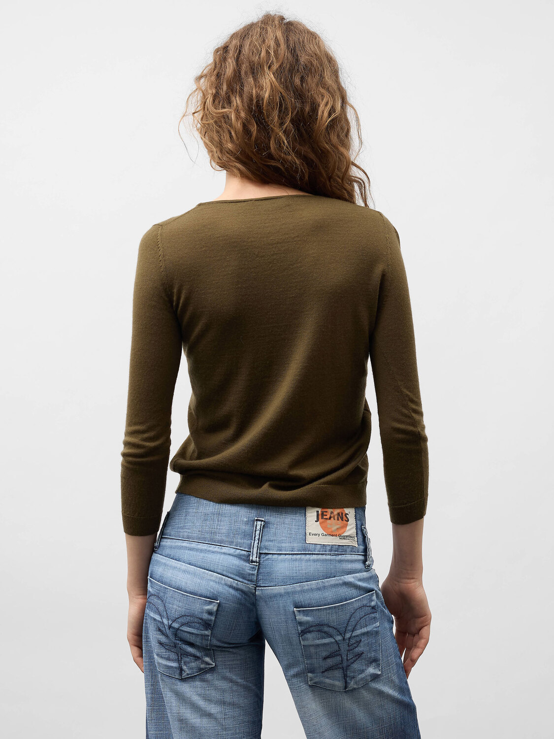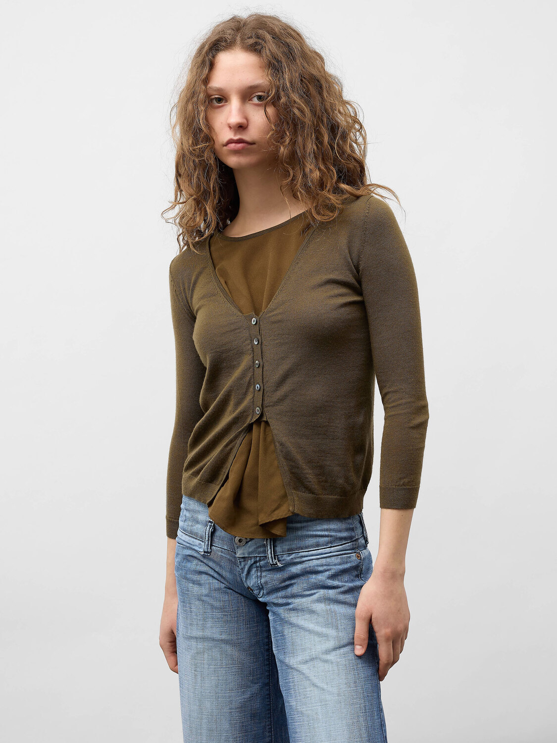 Stefanel khaki wool fine-knit double layer effect button-up cardigan with chiffon panel underneath.