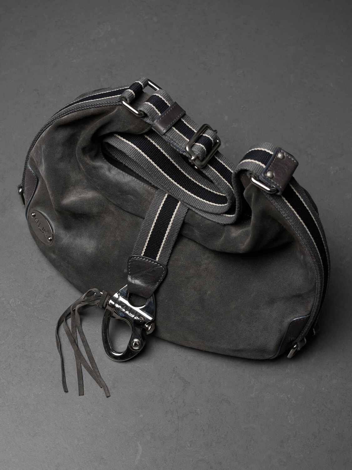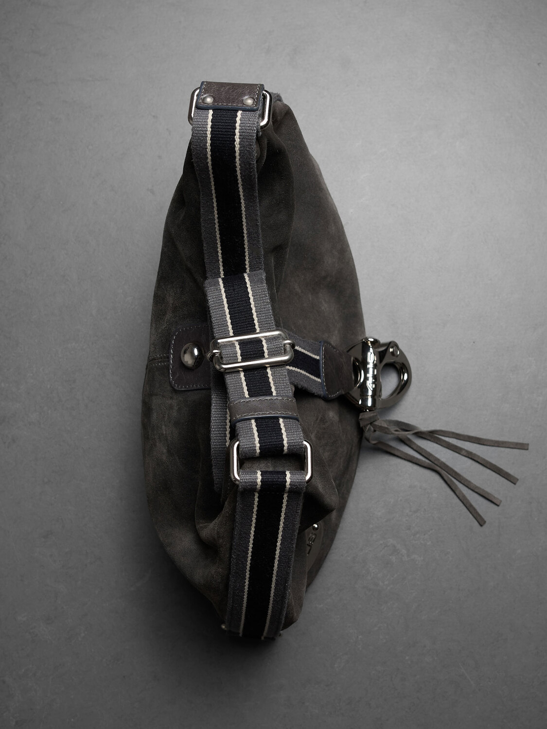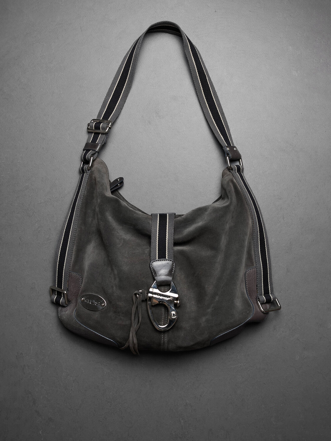 4US by Cesare Paciotti grey suede large hobo bag featuring silver-tone hardware and canvas adjustable utility-style strap. Leather reinforcements. Zipper closure.