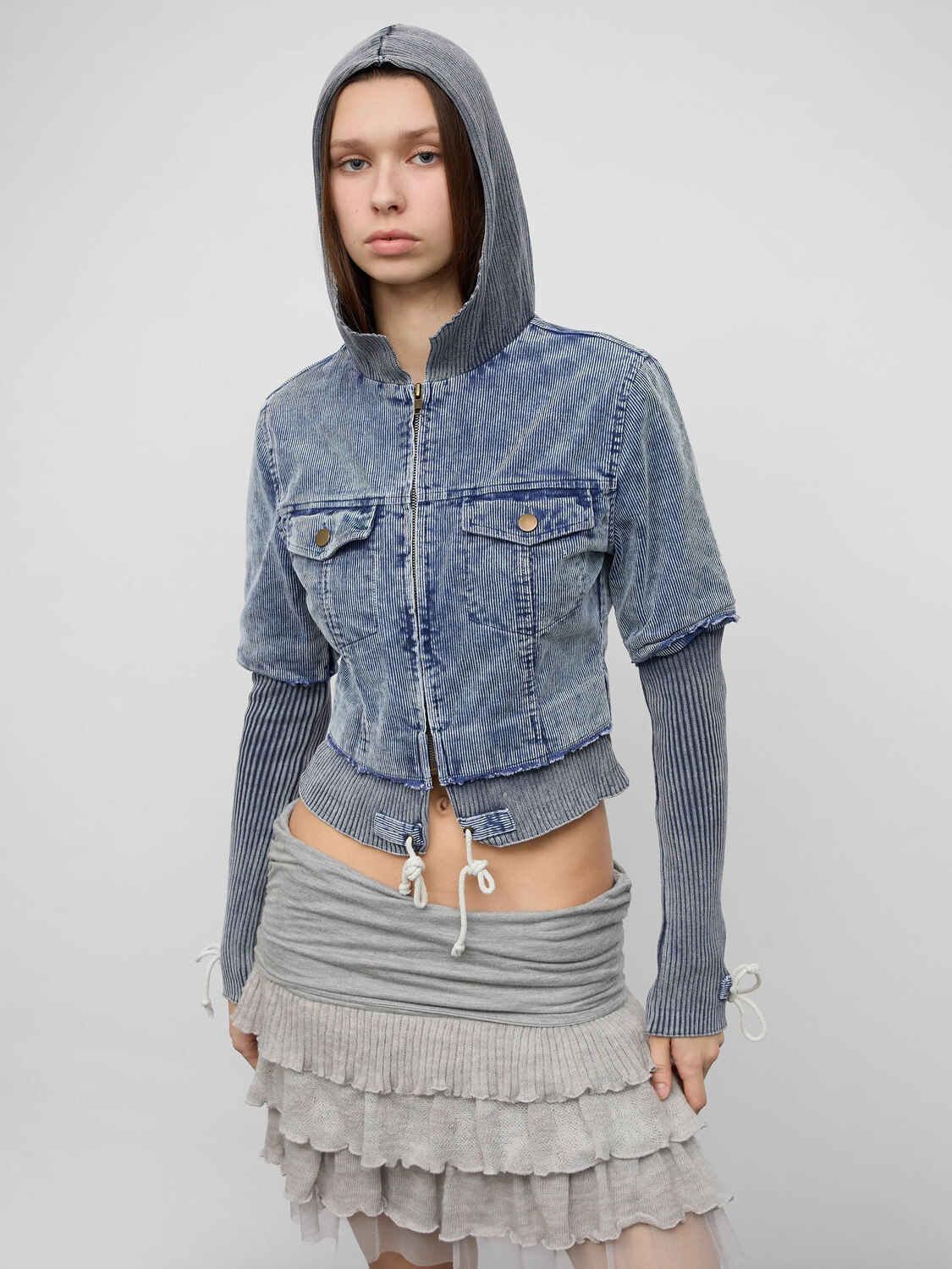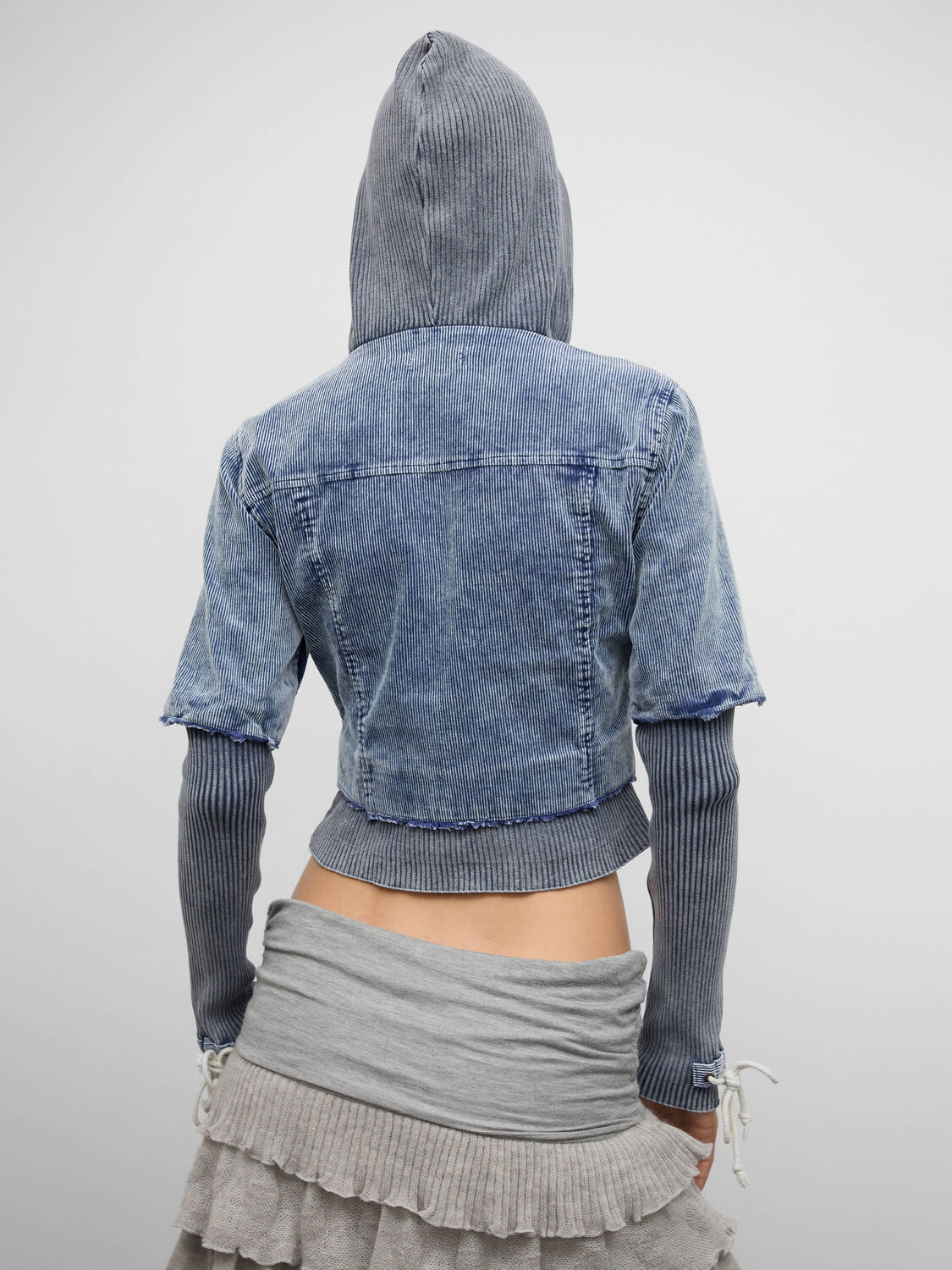 Blue and grey acid wash corduroy cropped jacket with rib-knit sleeves, hood and hem.