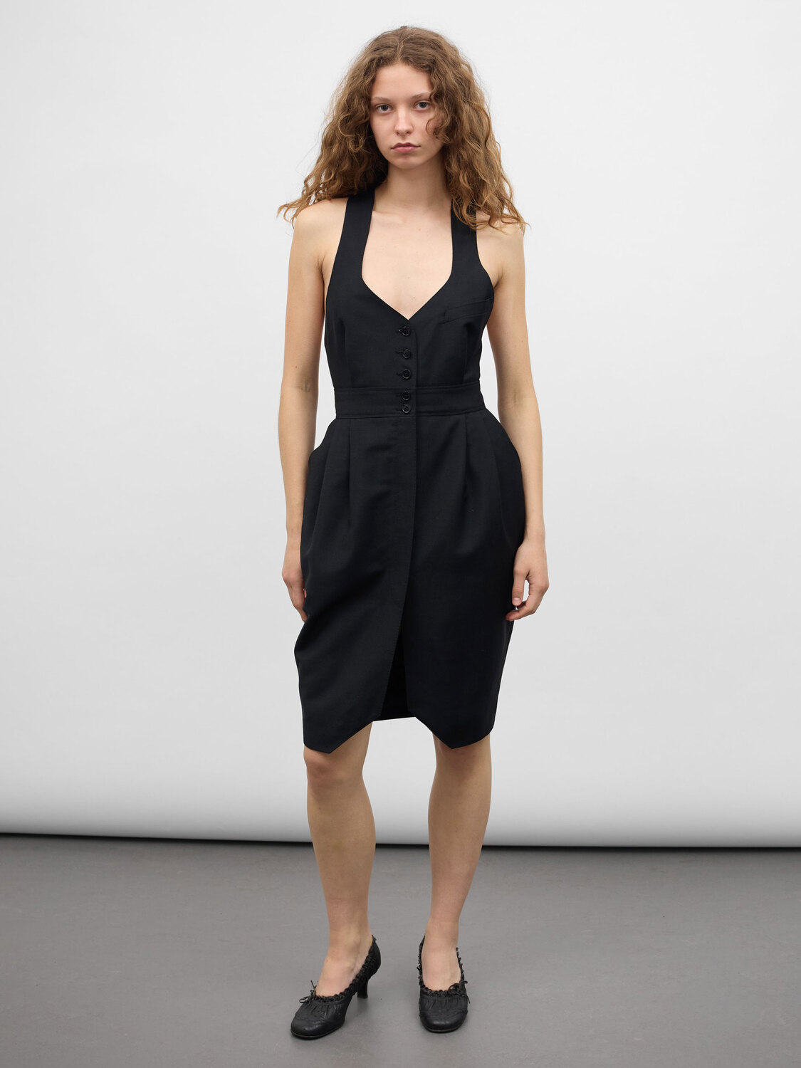 Acne (Jeans line) black dungaree dress featuring gathered waist, a slit at the front, two pockets on sides, and a small chest pocket.