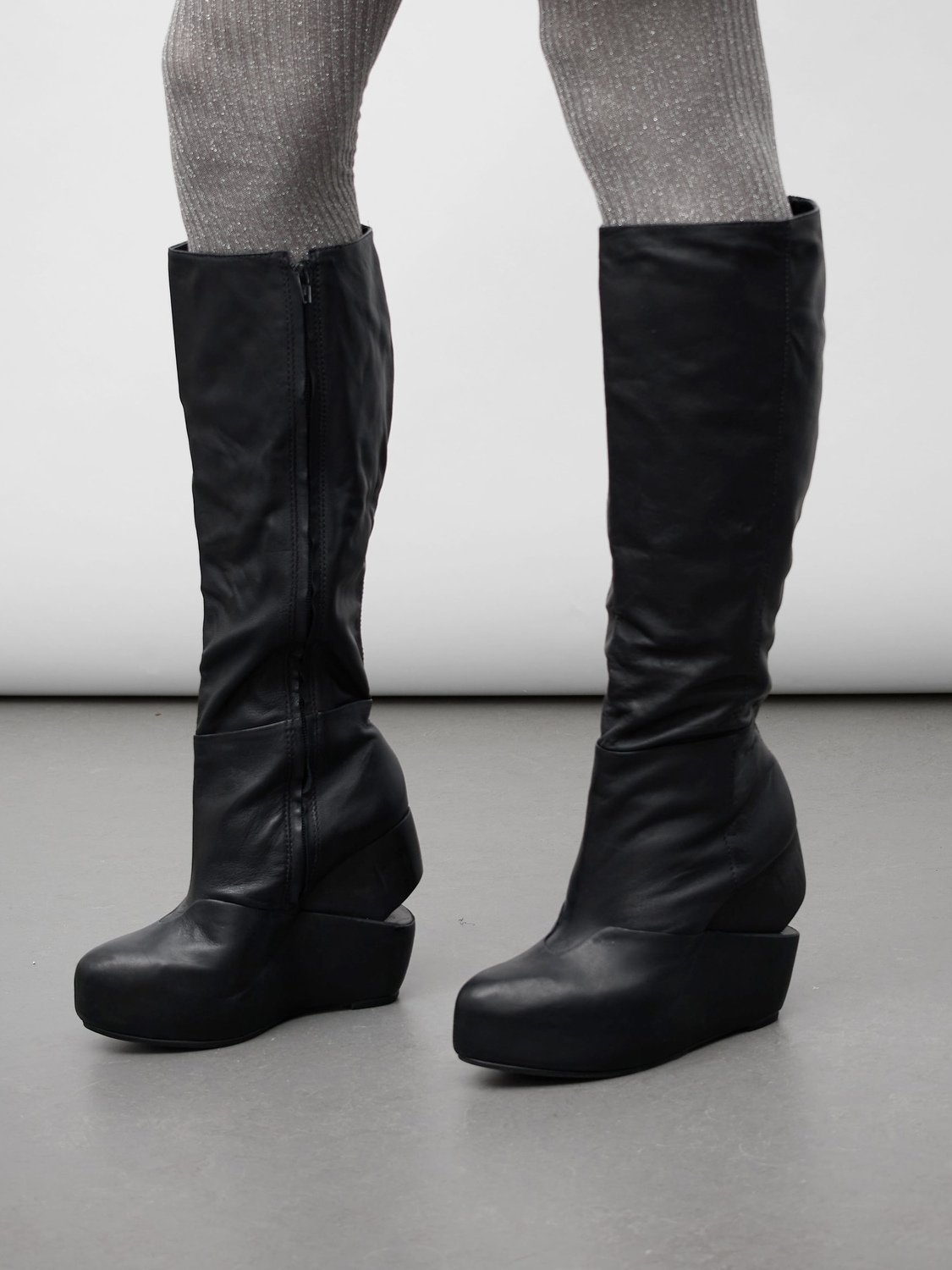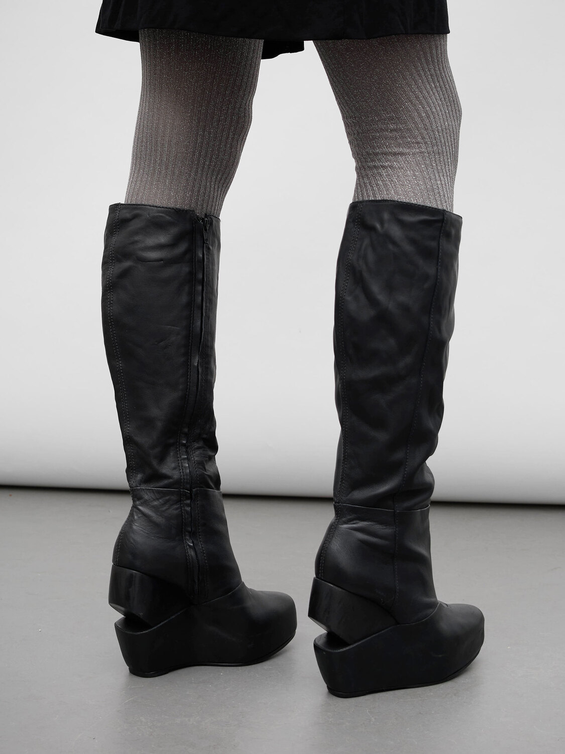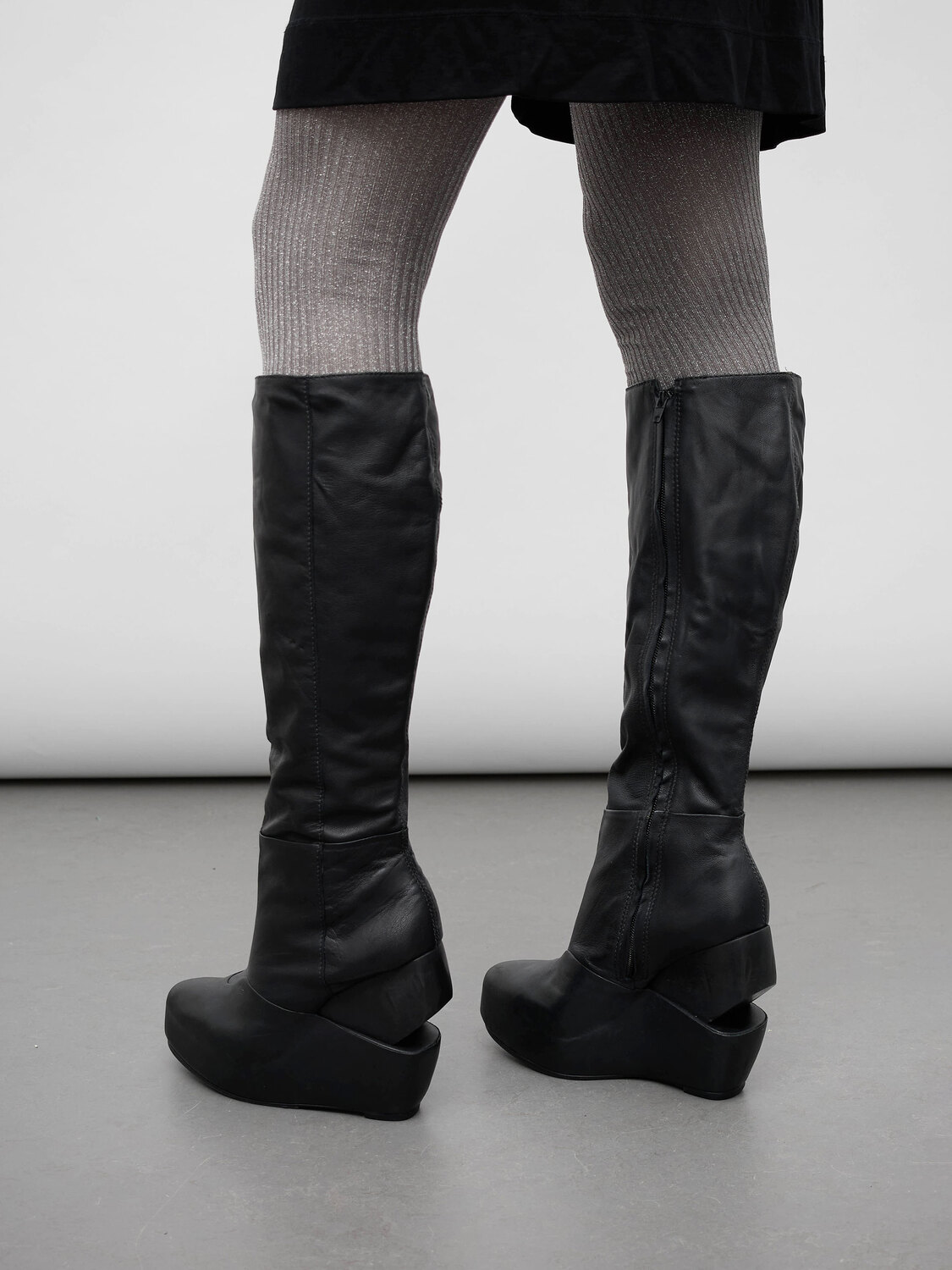 All Saints black leather knee-high wedge boots. Cutout detail heels. Zipper closure.