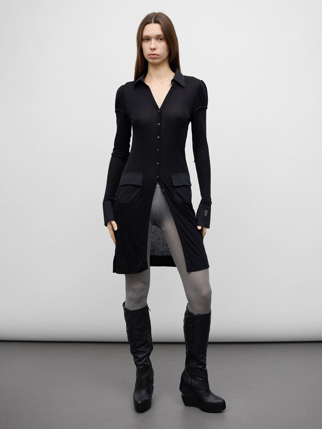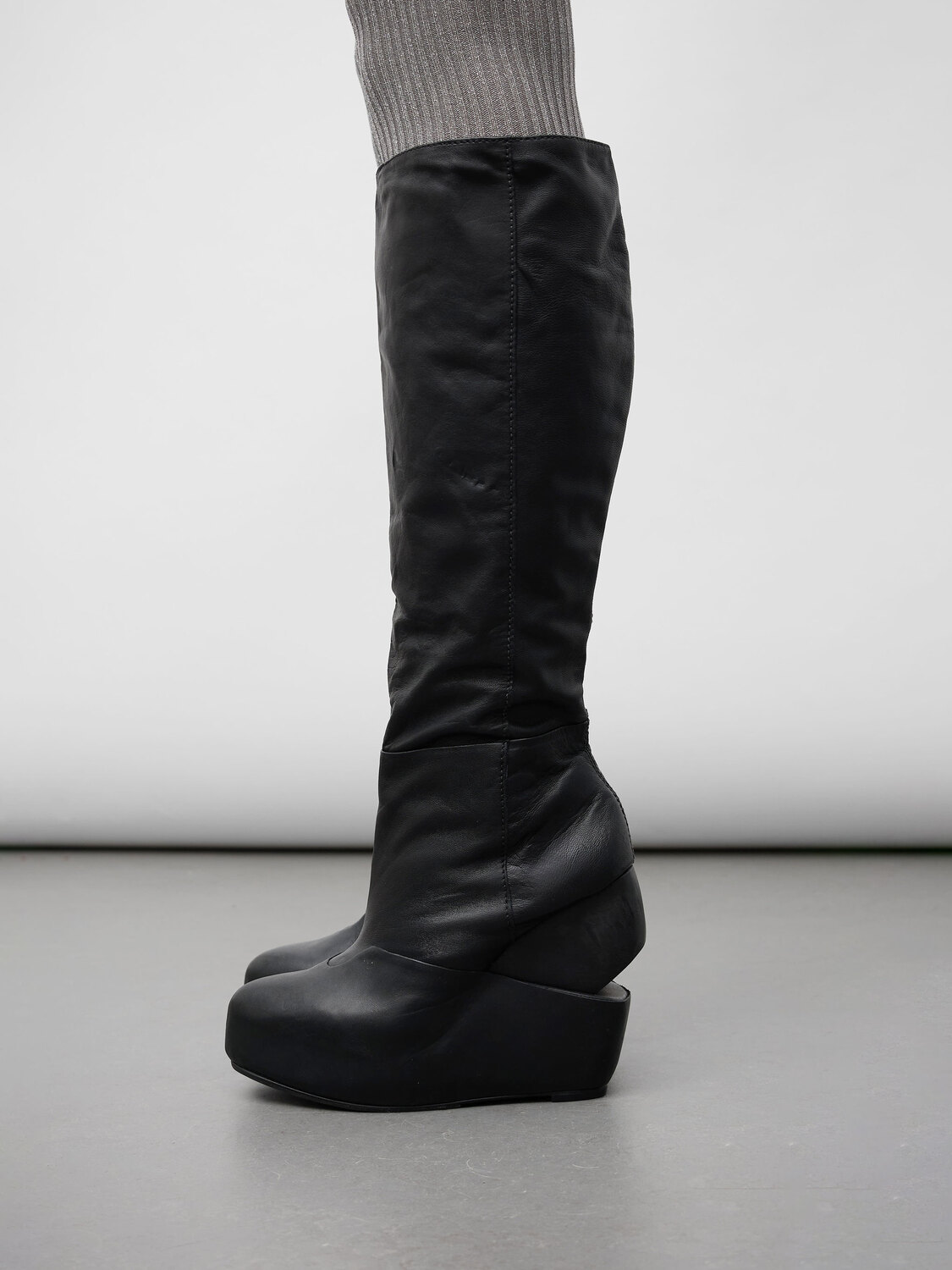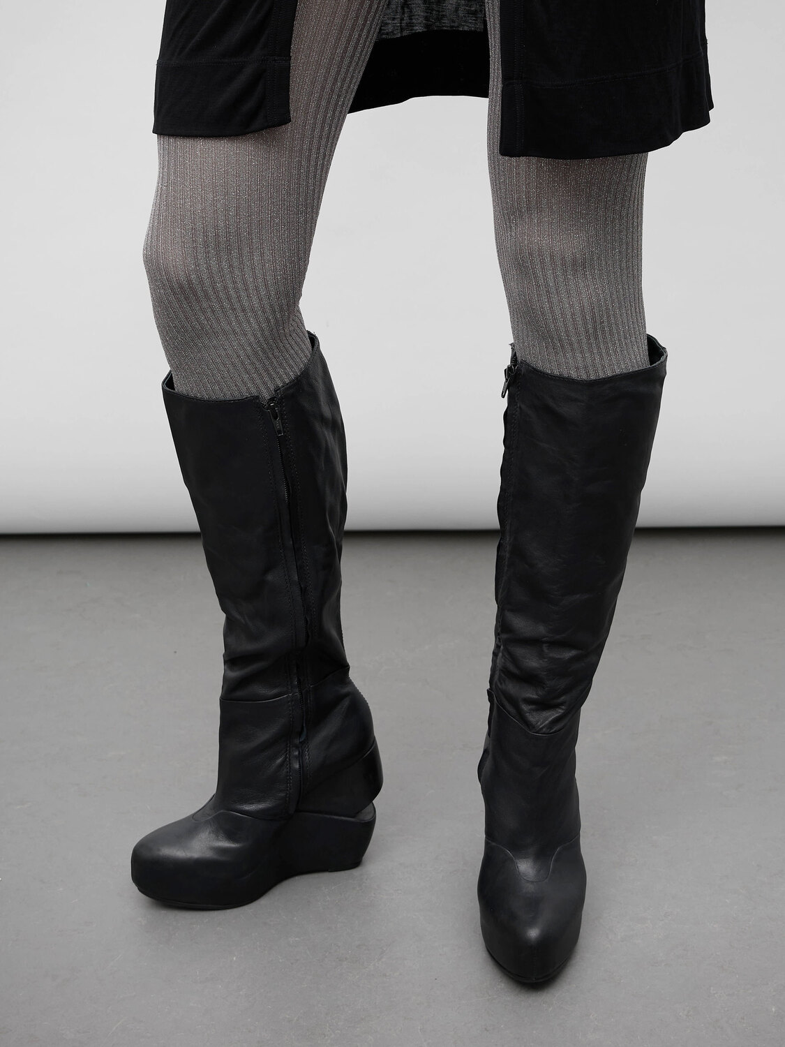 All Saints black leather knee-high wedge boots. Cutout detail heels. Zipper closure.