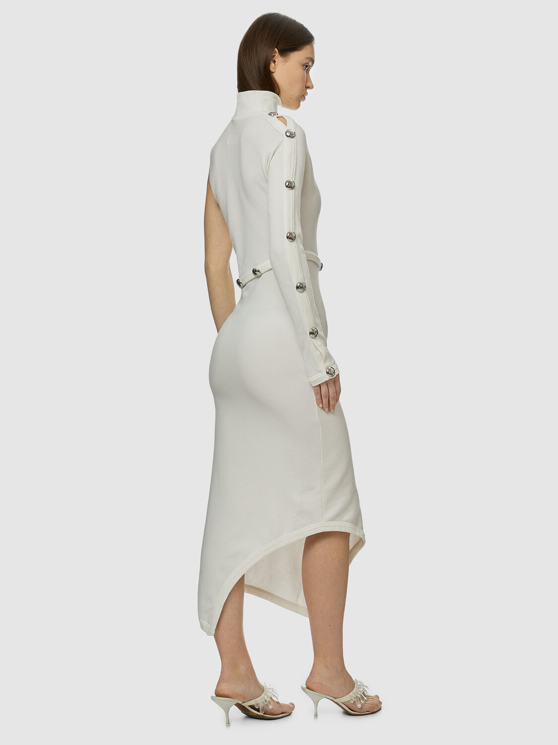 BACK by Ann-Sofie Back white stretchy rib-knit asymmetric maxi dress with decorative silver-tone buttons.