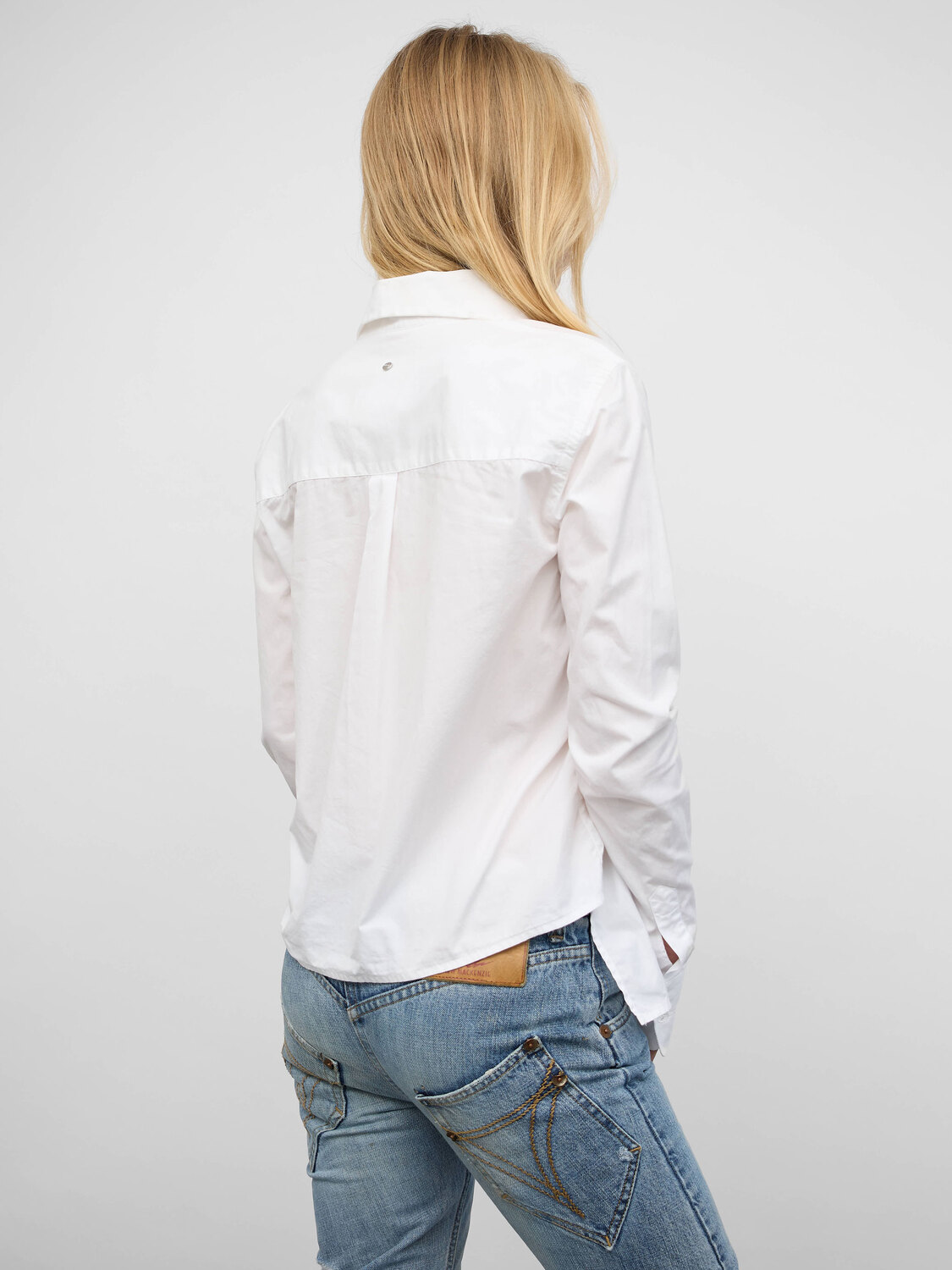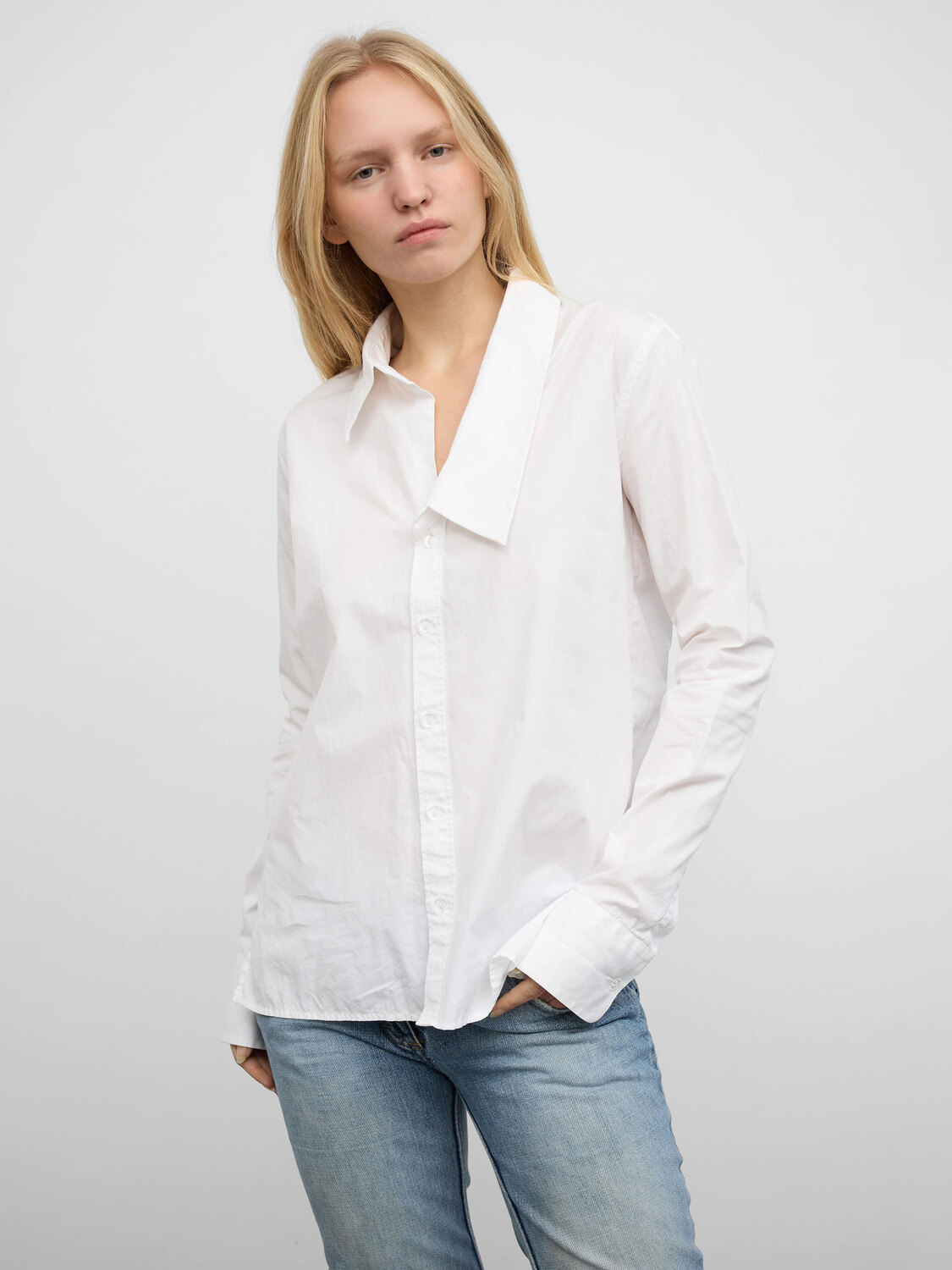 Ann-Sofie Back white asymmetric collar shirt featuring and elongated front.