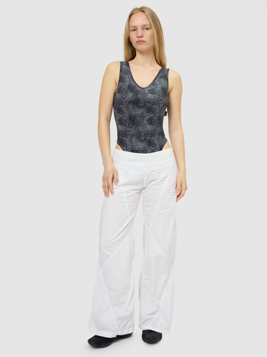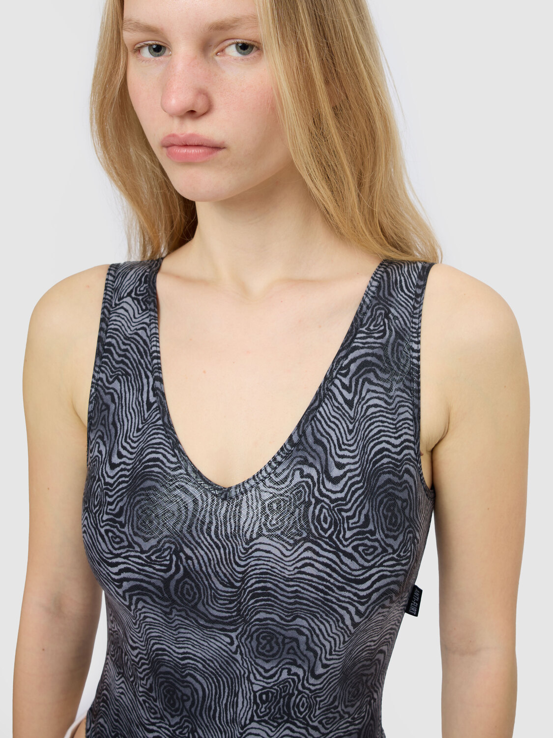 Anti-Flirt black and slate stretchy nylon sleeveless high leg bodysuit with a shimmery animal-inspired abstract print. Snap button closure at the bottom.