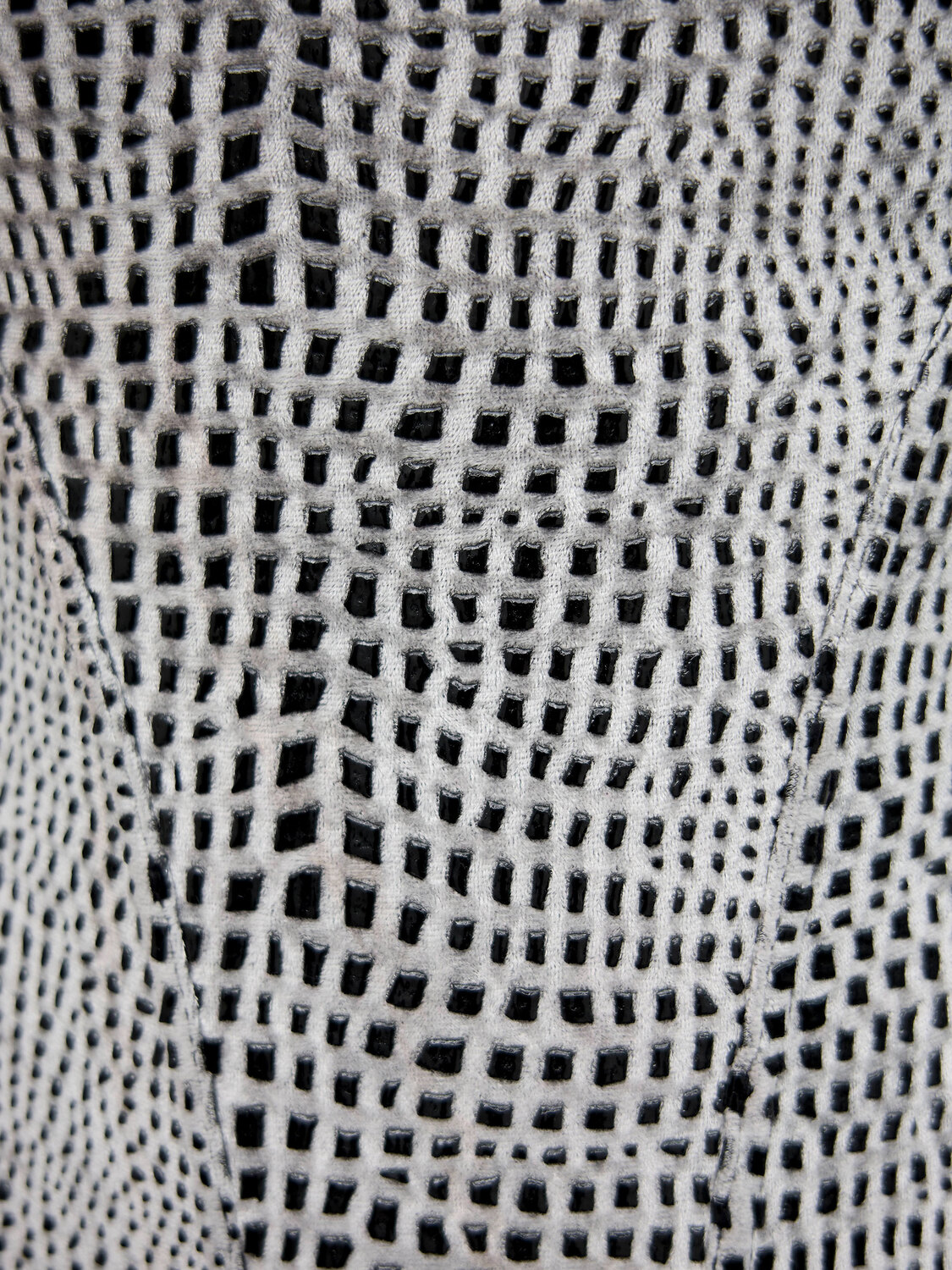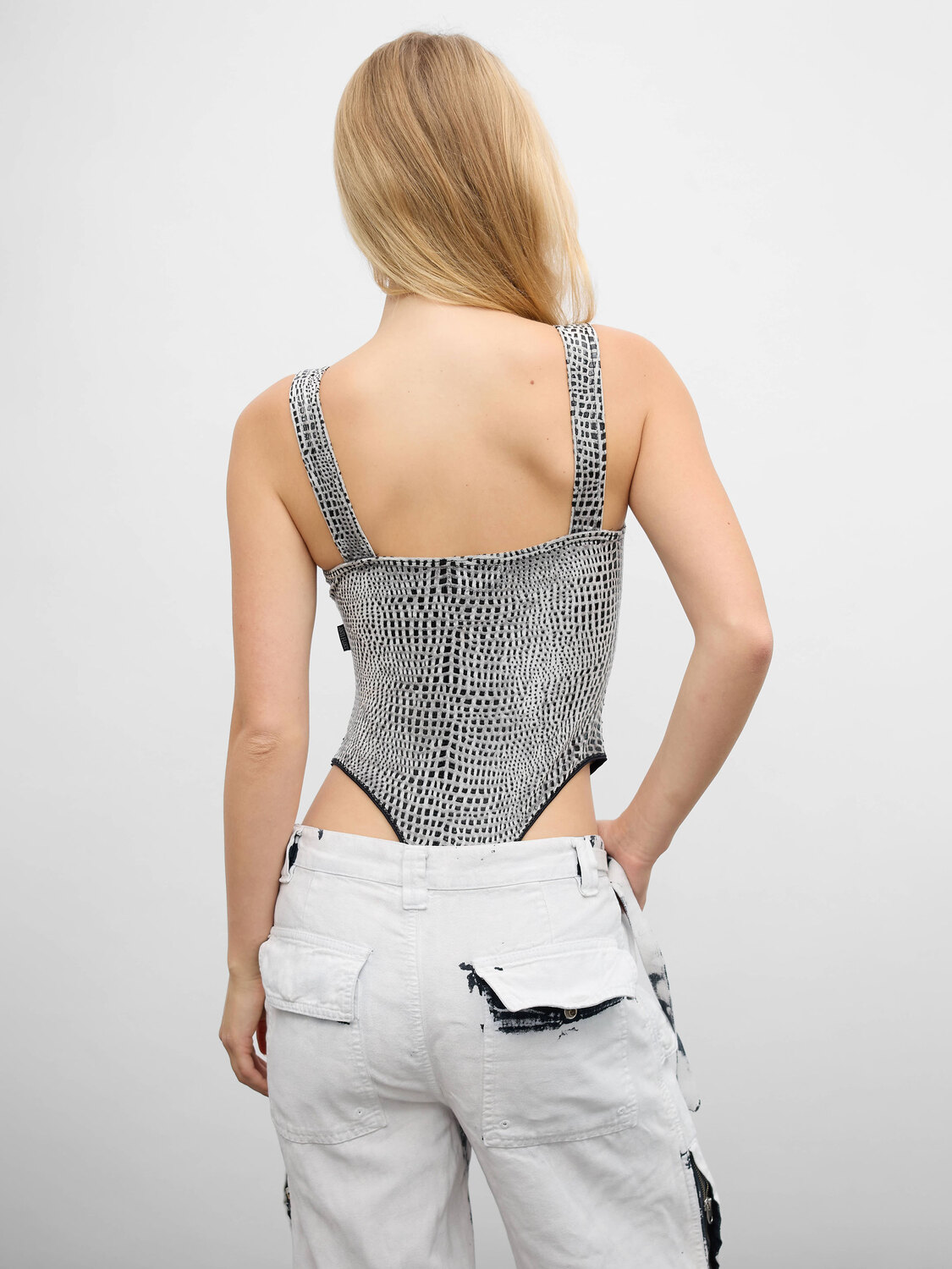 Anti-Flirt grey stretchy velvet high leg bustier/bodysuit with a glossy black embossed animal-inspired abstract print. Snap button closure at the bottom.
