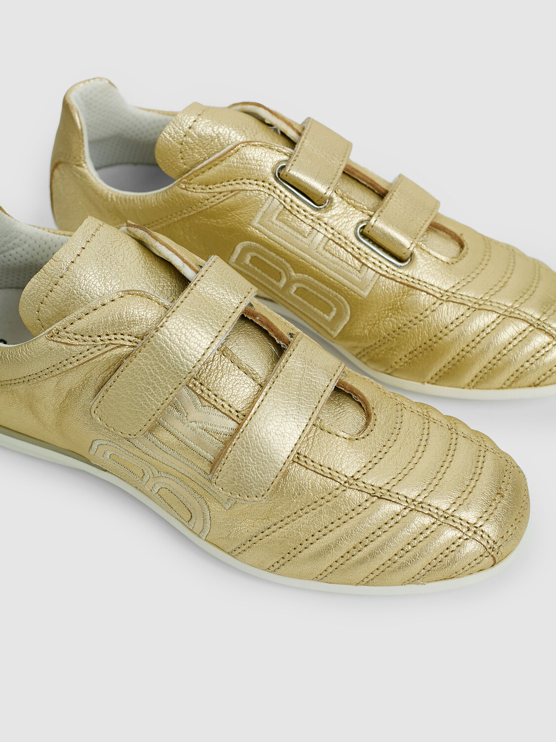 Bikkembergs gold metallic leather sneakers with football-boot inspired design, velcro straps and logo embroidery on the sides. White spiked rubber sole. White sports mesh lining.