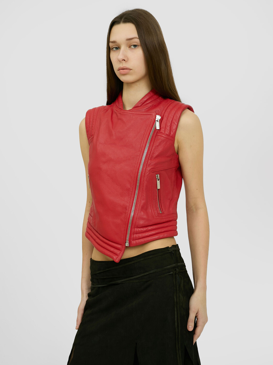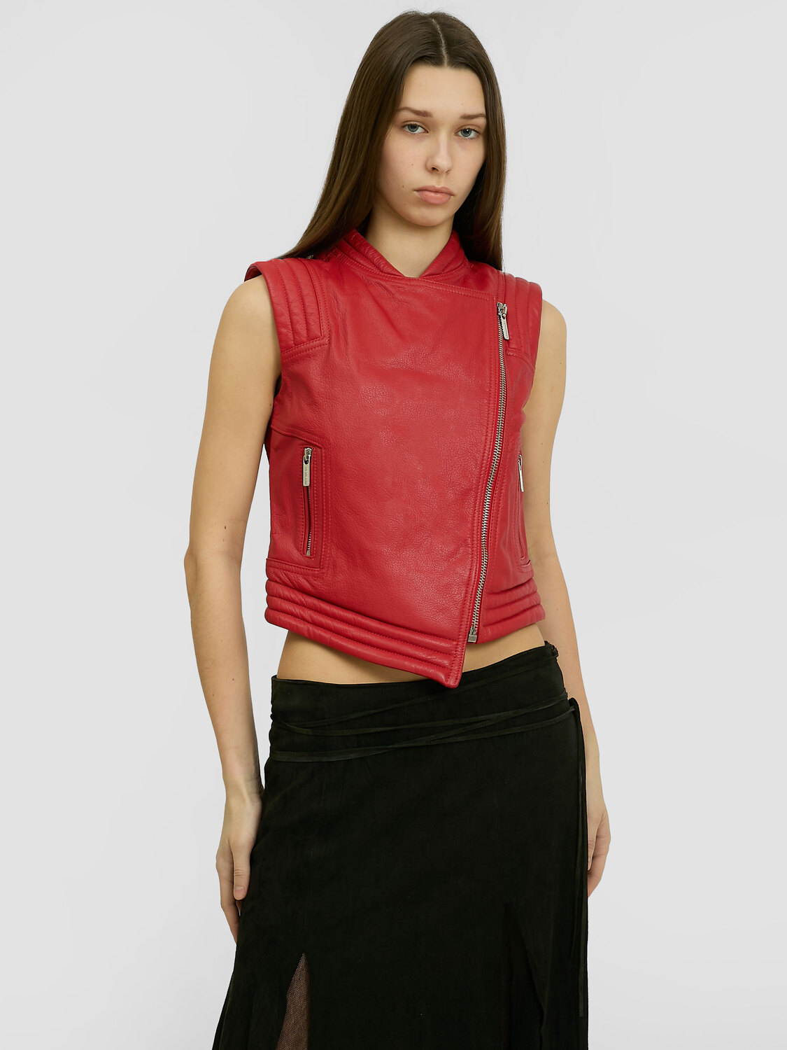 Bikkembergs red leather biker-style vest with zipper closure, padded detail and asymmetrical hem.