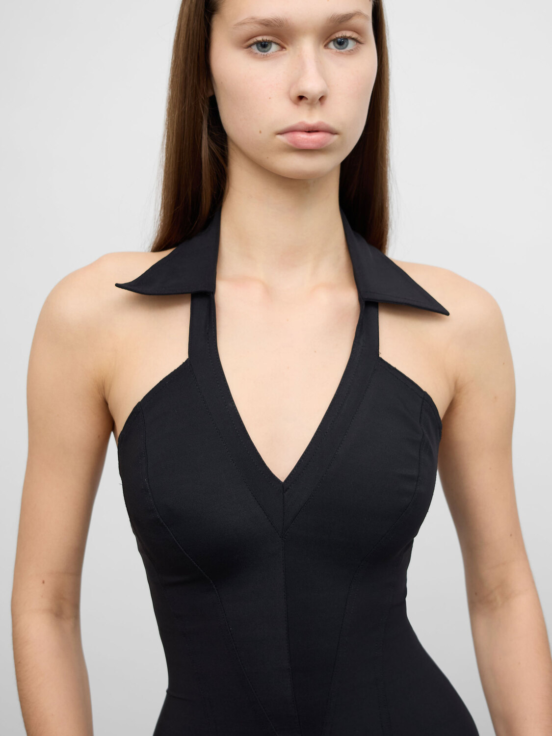 Black stretchy nylon bustier halter top with a concealed zipper closure at the back.