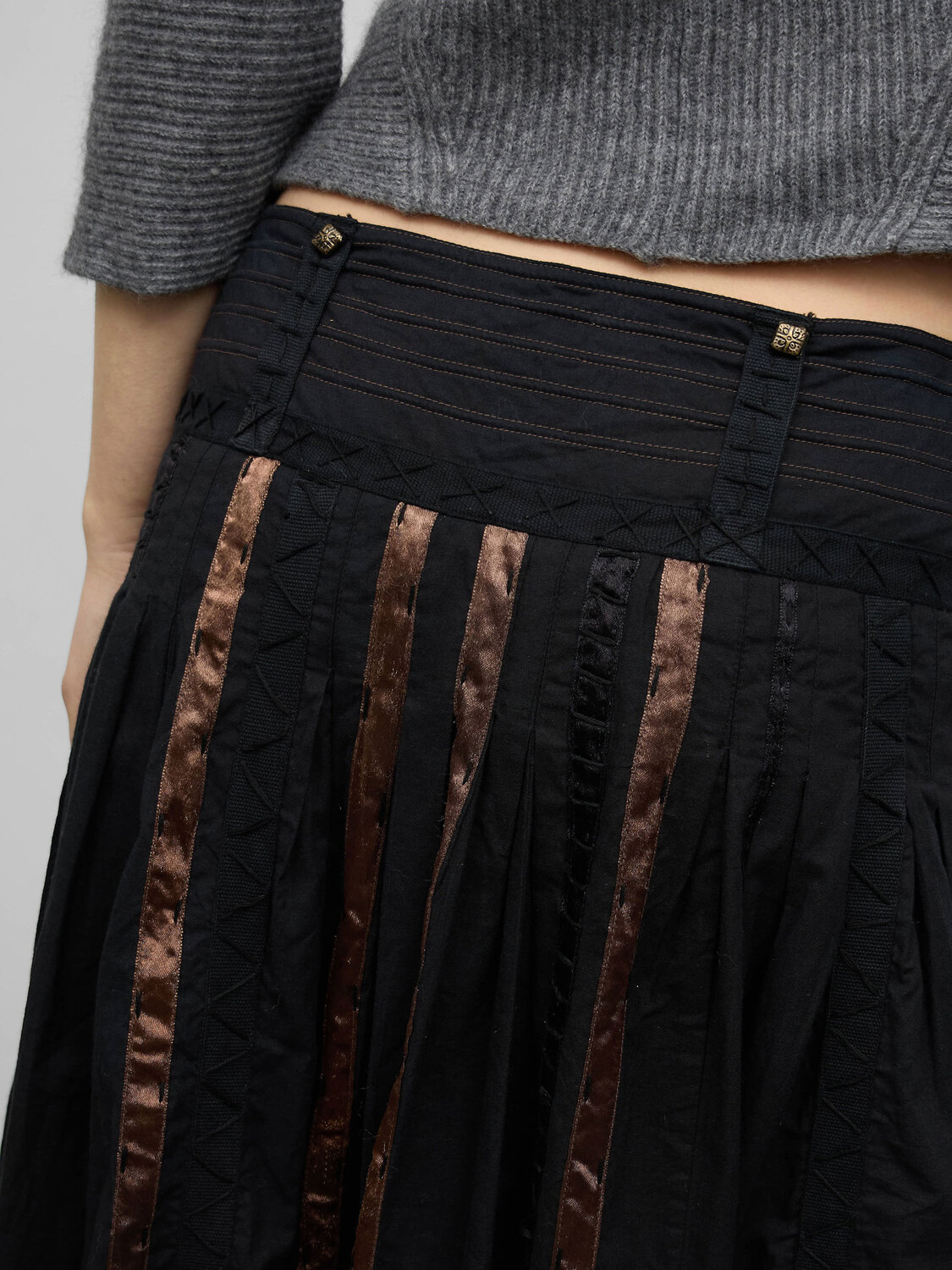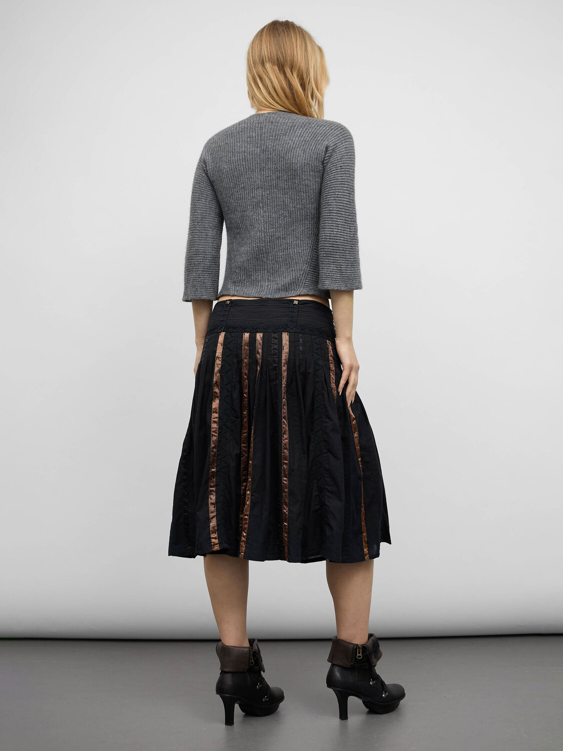 Black pleated midi skirt with bronze satin vertical stripes and stitching details. Concealed zipper closure on the side.