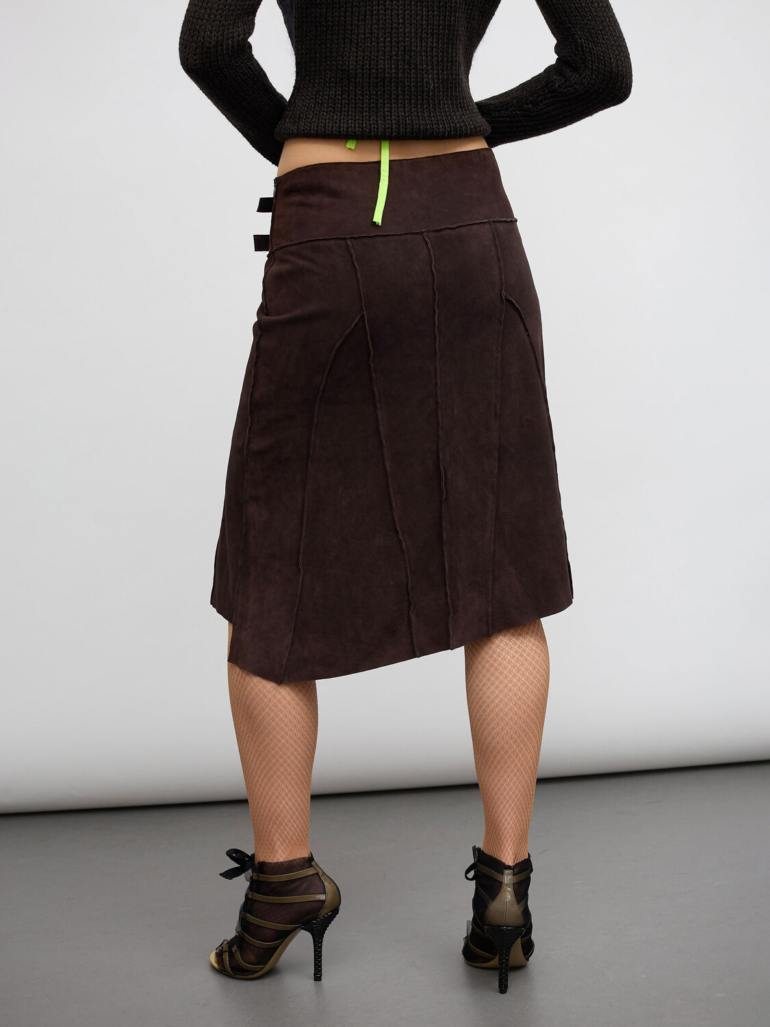 Brown suede midi skirt with adjustable double straps at the waist. Dart stitching details all over. Asymmetrical hem with a middle slit. Concealed zipper closure on the side. Satin lining.
