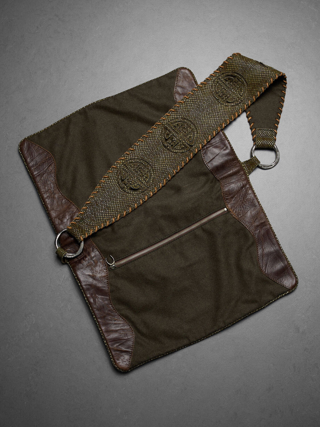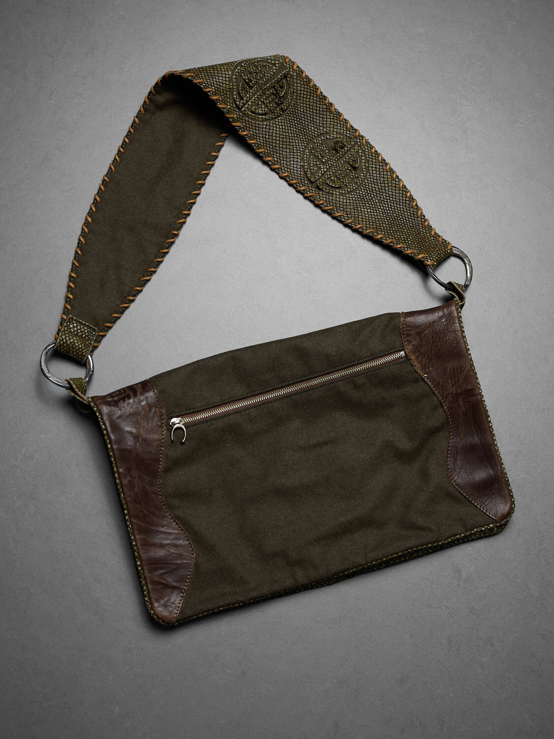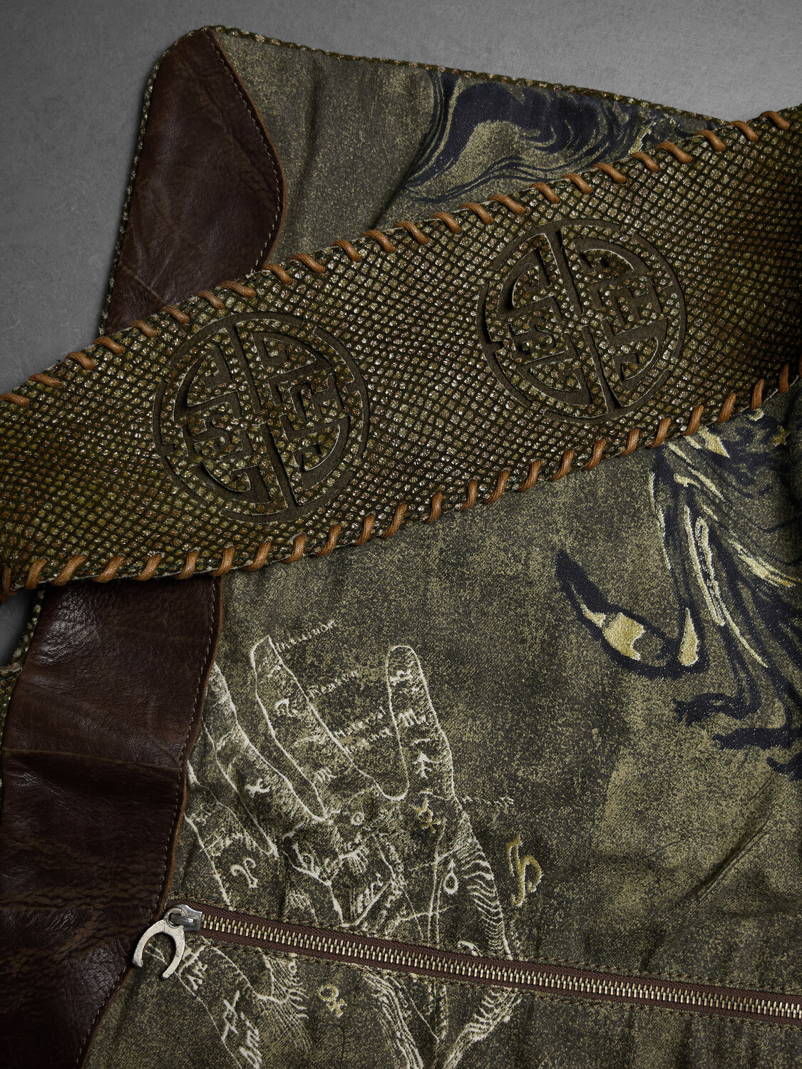 Just Cavalli astrology print canvas and dark green wool crossbody bag with brown leather reinforcements, wide shoulder strap and internal zipper pockets with snakeskin print lining.