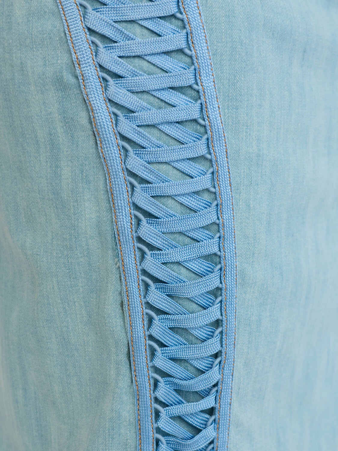Christian Dior light blue denim midi skirt with lace-up detail on the sides. Concealed zipper closure at the back. From Spring 2002 collection.