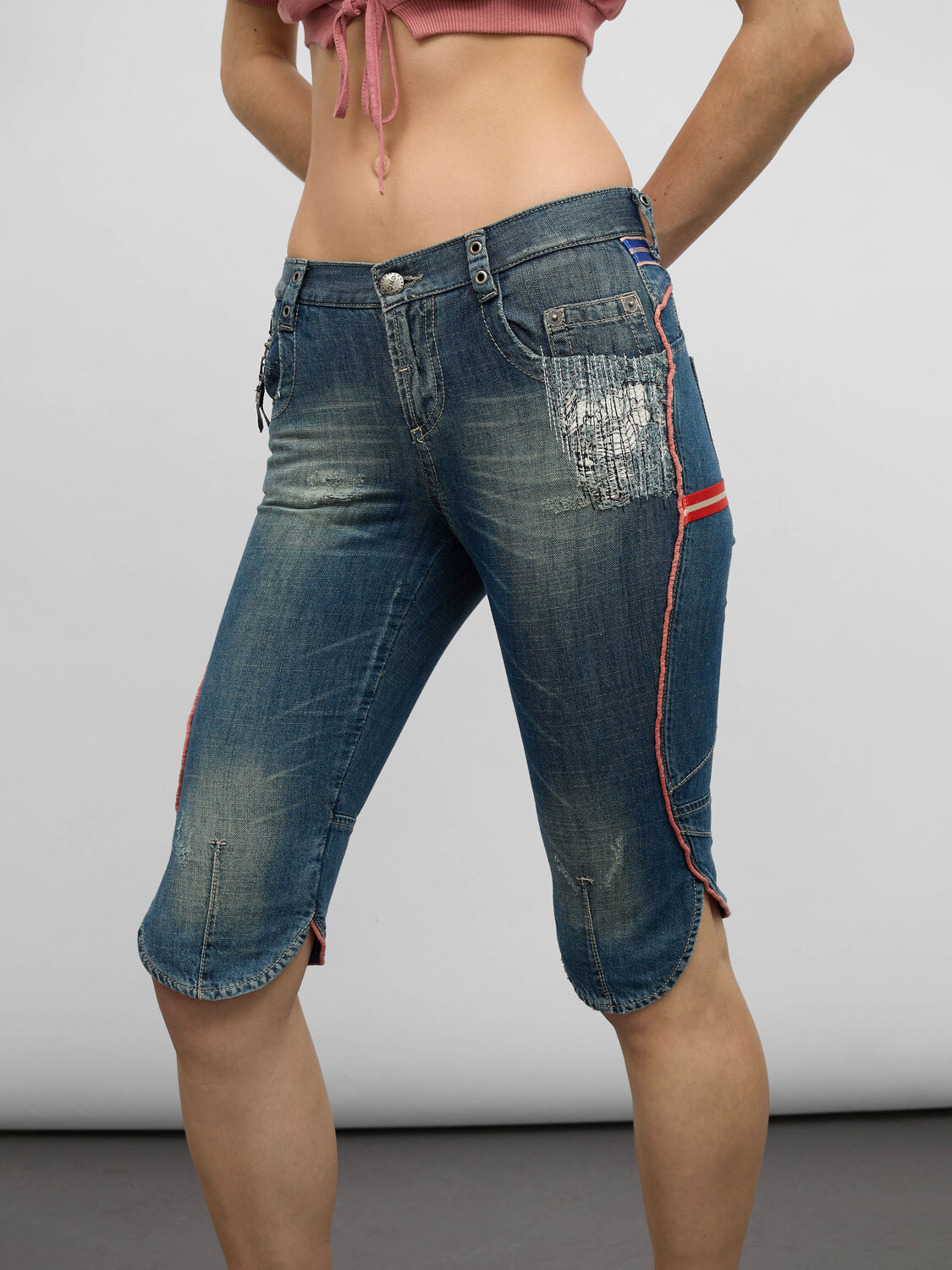 CNC Costume National blue denim low-rise distressed effect capri pants with pink piping, silver-tone metal grommet accents and multicolour utility strap style details.