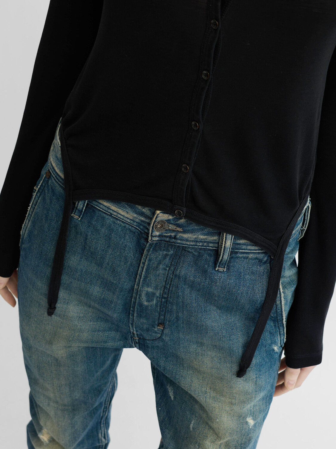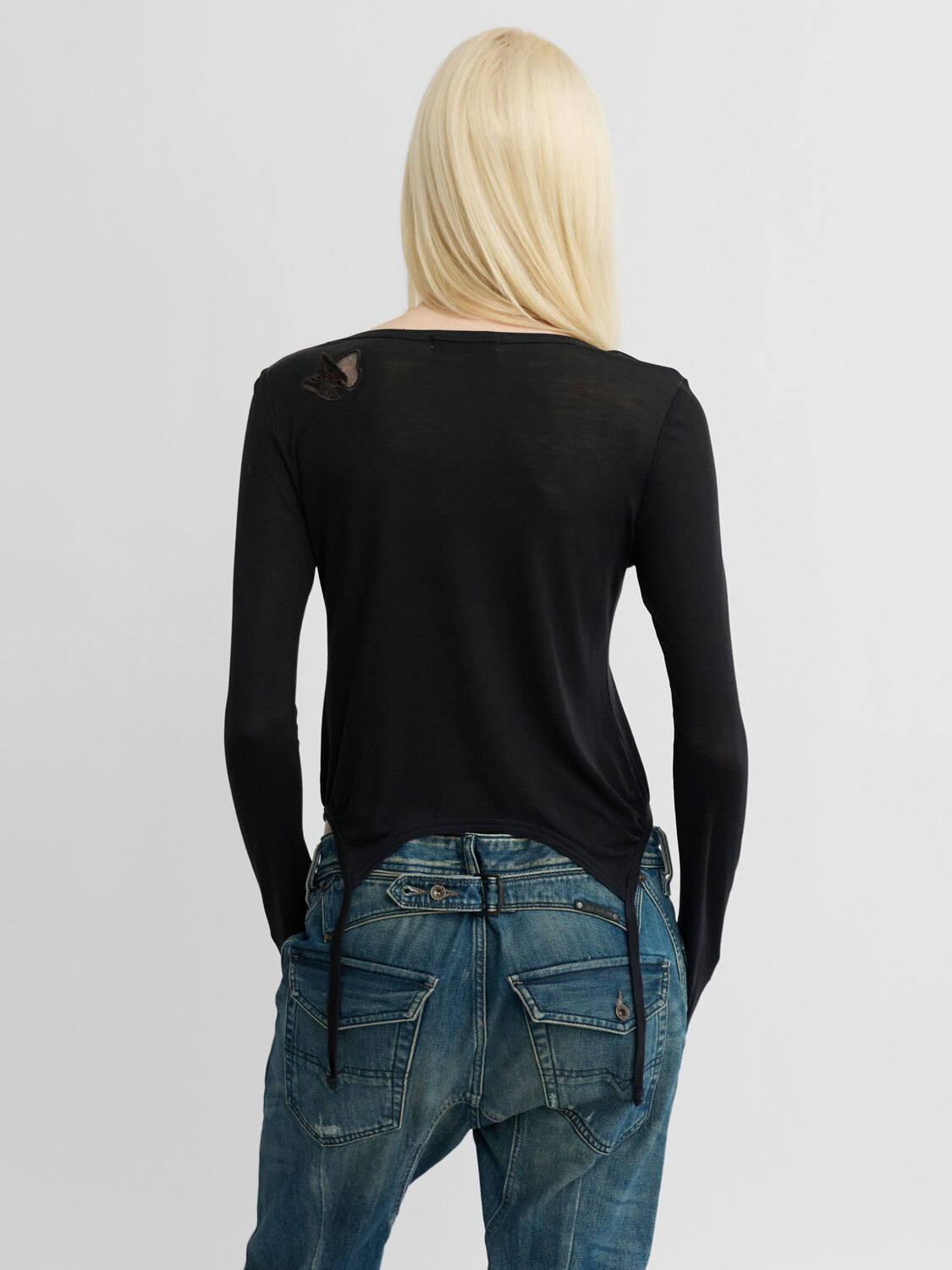 Cop Copine black button-up long cardigan with garter straps style ties and a butterfly embroidery on the shoulder.