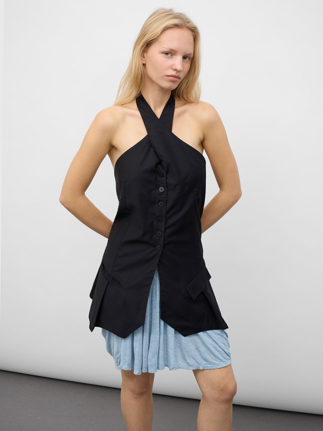 Model is XS/S, height 170 cm / 5’7”, the vest is pinned to fit the model for the photos