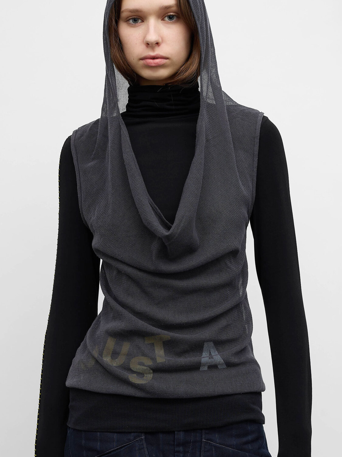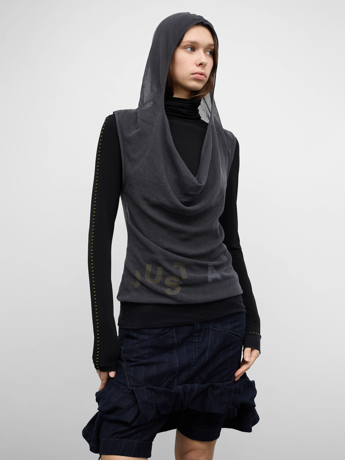 Cop Copine black turtleneck top with an integrated slate blue hooded mesh top.