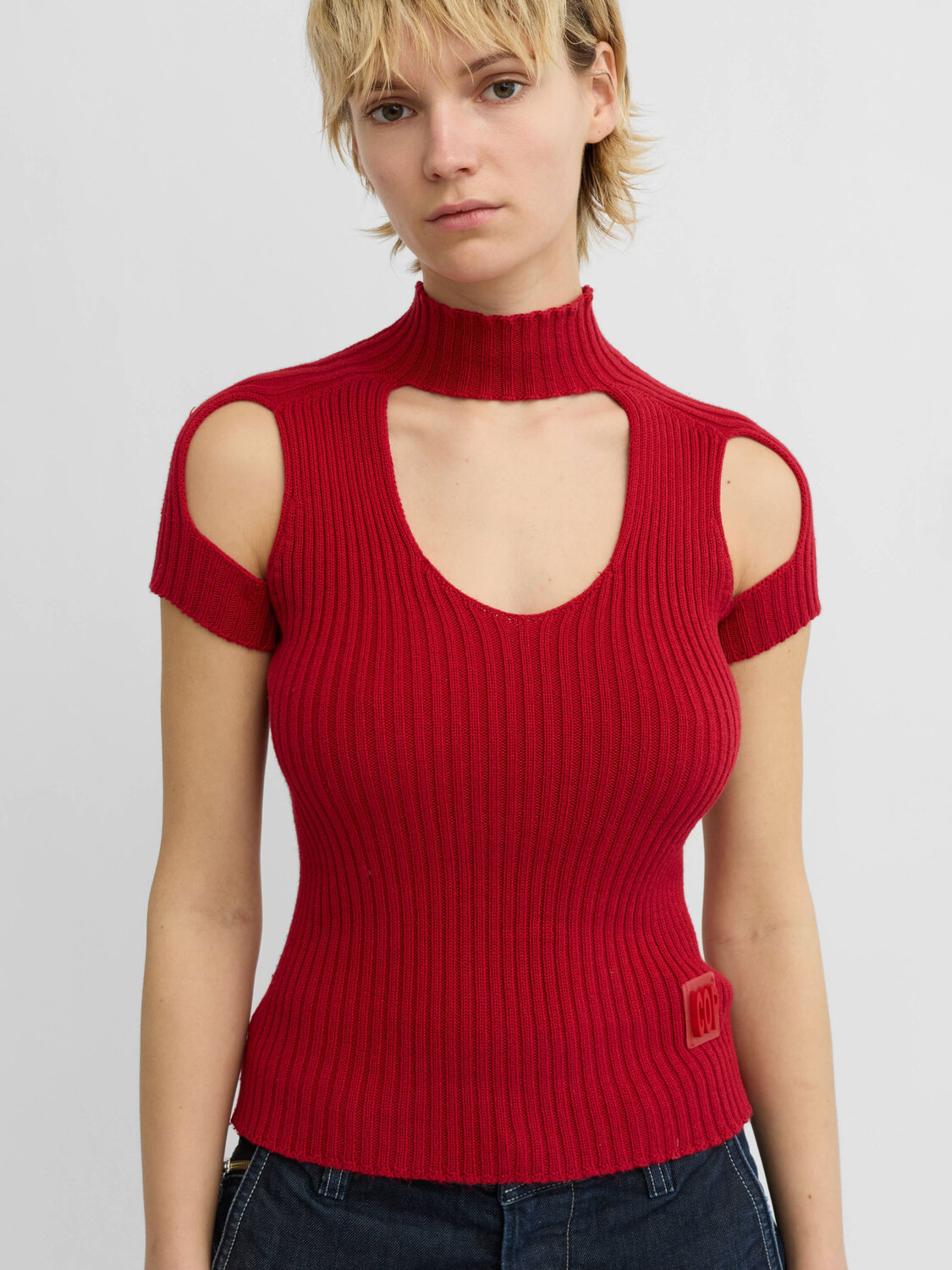 Cop Copine red knitted mock-neck top with cutout details.