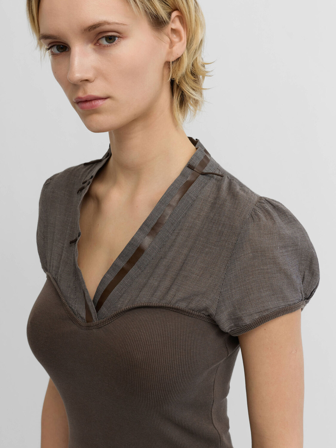 Cop Copine grey and brown 2 in 1 t-shirt. Gathered sleeves. Rib-knit lower panel.