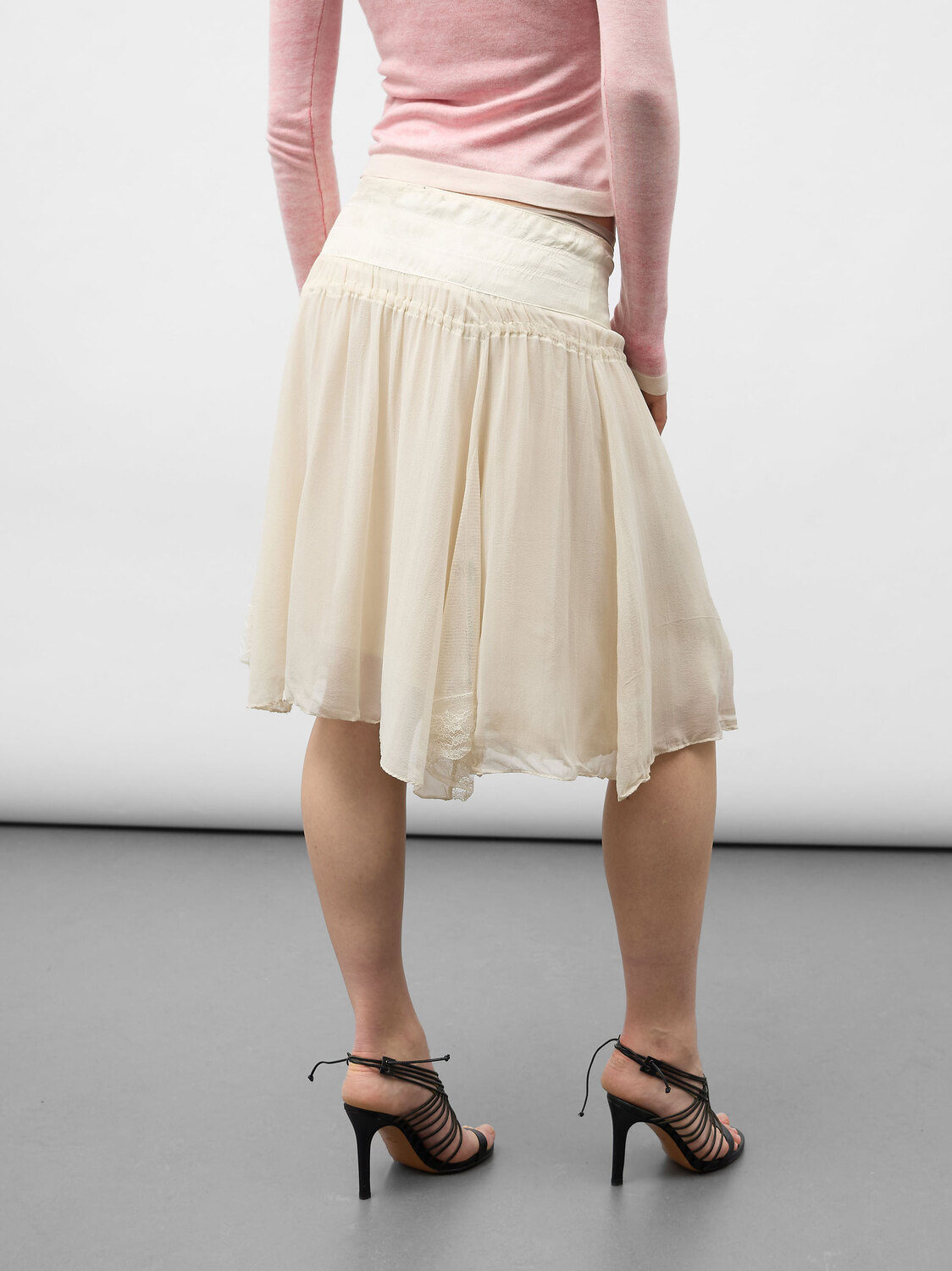 Cream chiffon pleated skirt with lace details and ties. Distressed effect. Concealed zipper closure on the side. Satin lining.