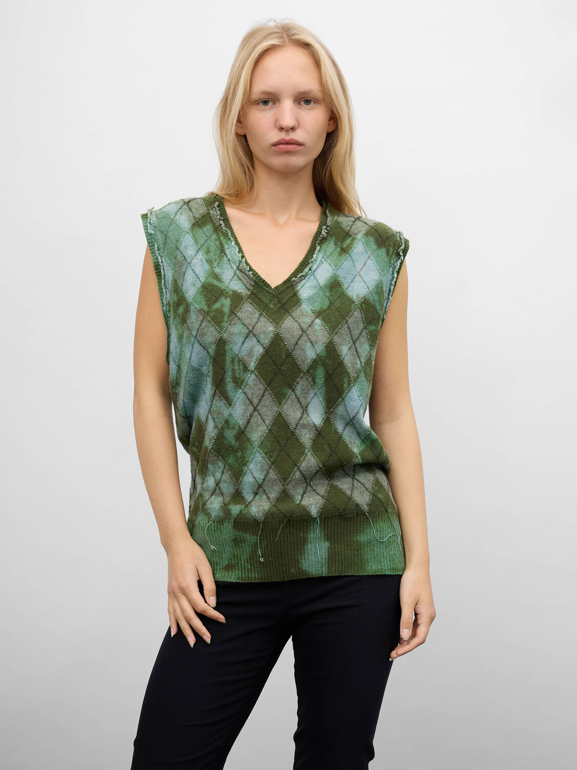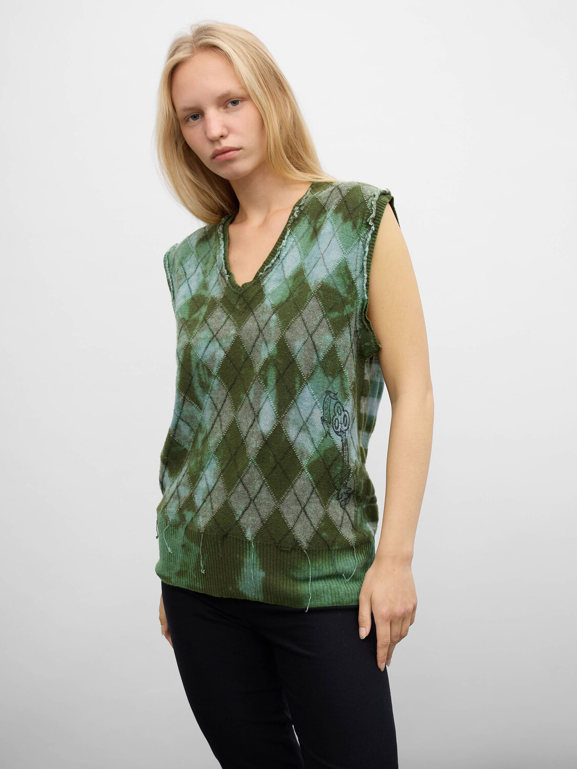 Diesel green and grey tone argyle knitted vest with raw finish. V-Neck. Rib-knit edges.