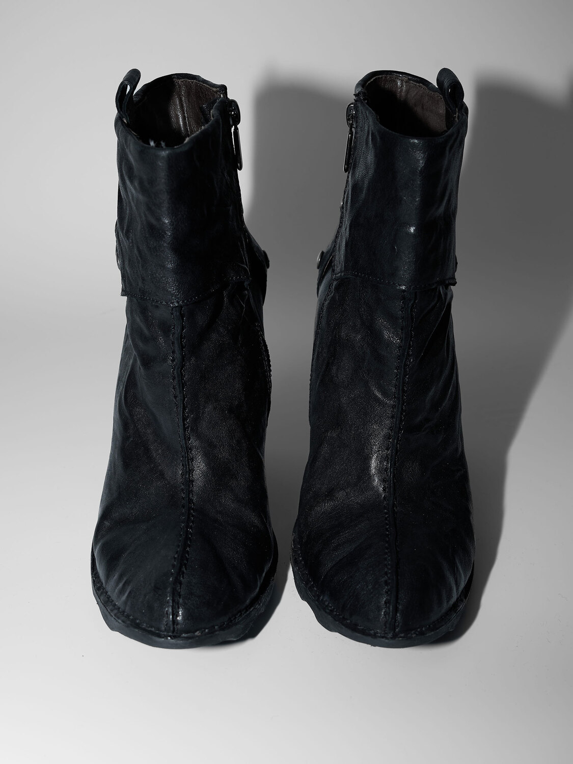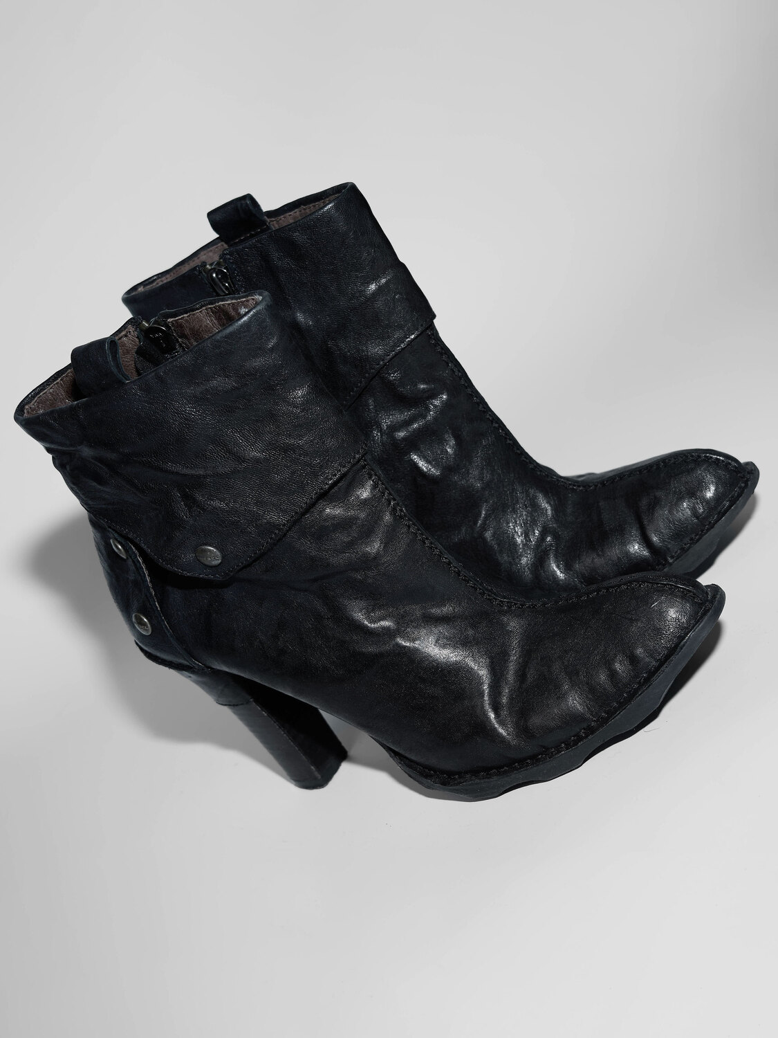 Diesel black wrinkled effect leather heeled boots featuring a zipper closure, inside-out seam detail and logo studs.