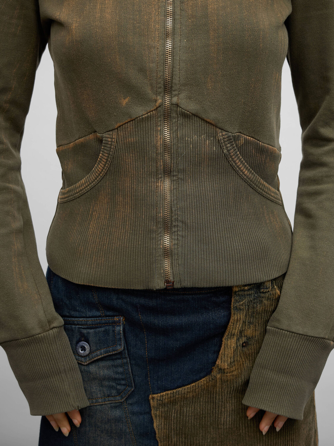 Diesel bleached khaki green cotton zip-up cardigan with ribbed hem, neckline, and cuffs.