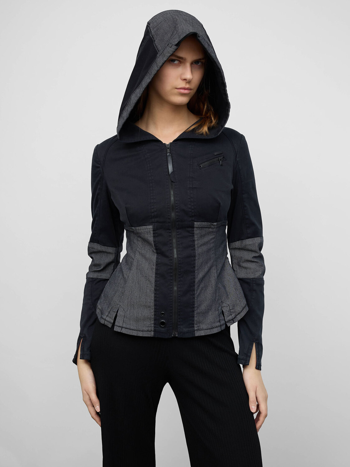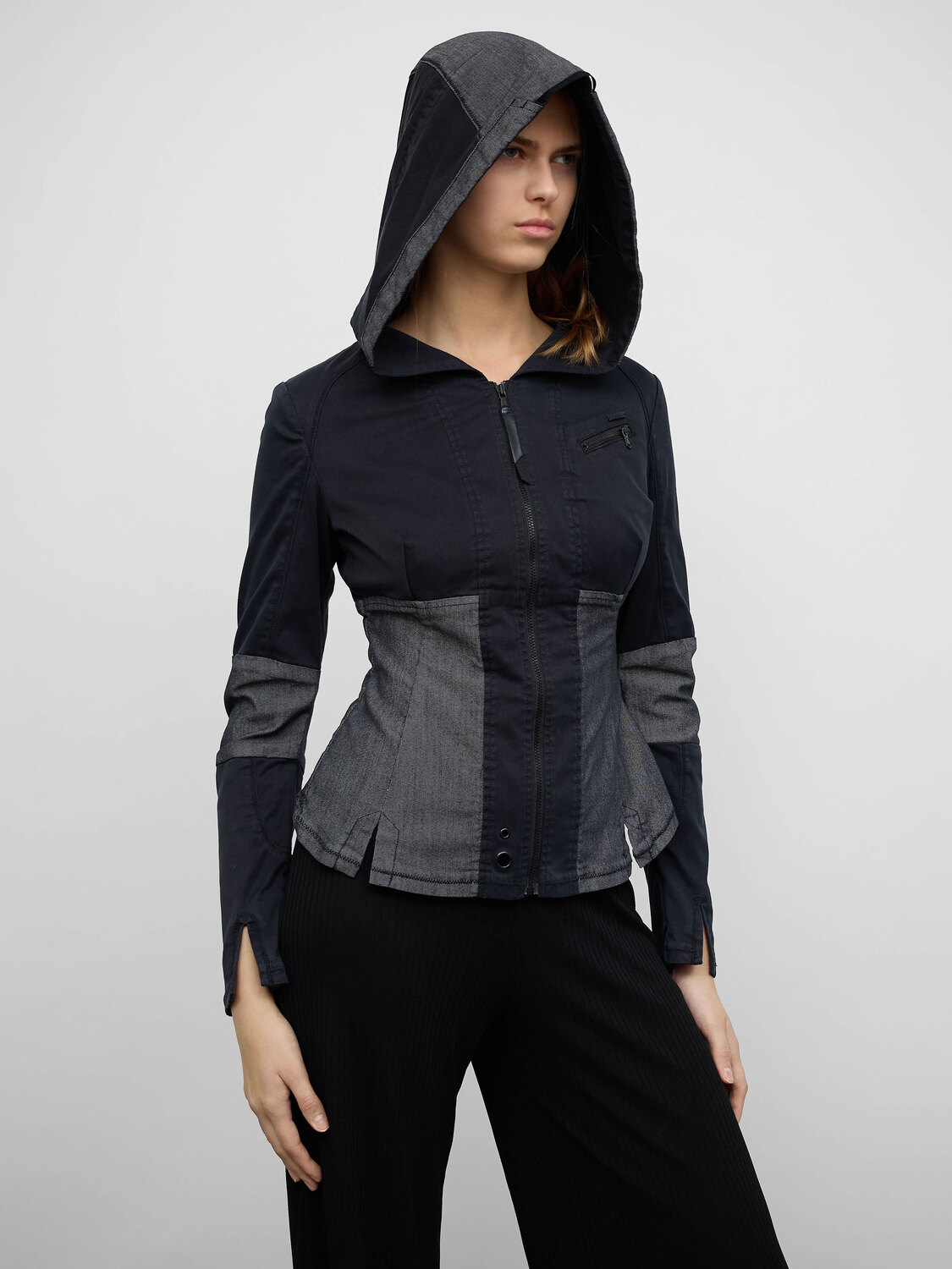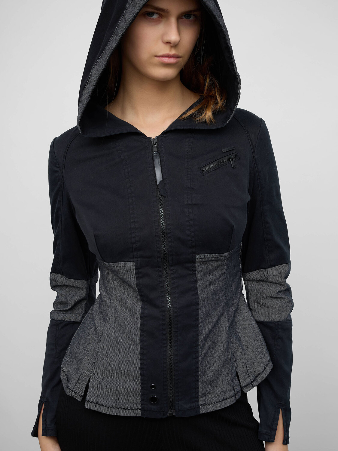 Diesel black and grey deconstructed zip-up jacket with a small chest pocket, hood and lace-up detail at the back.
