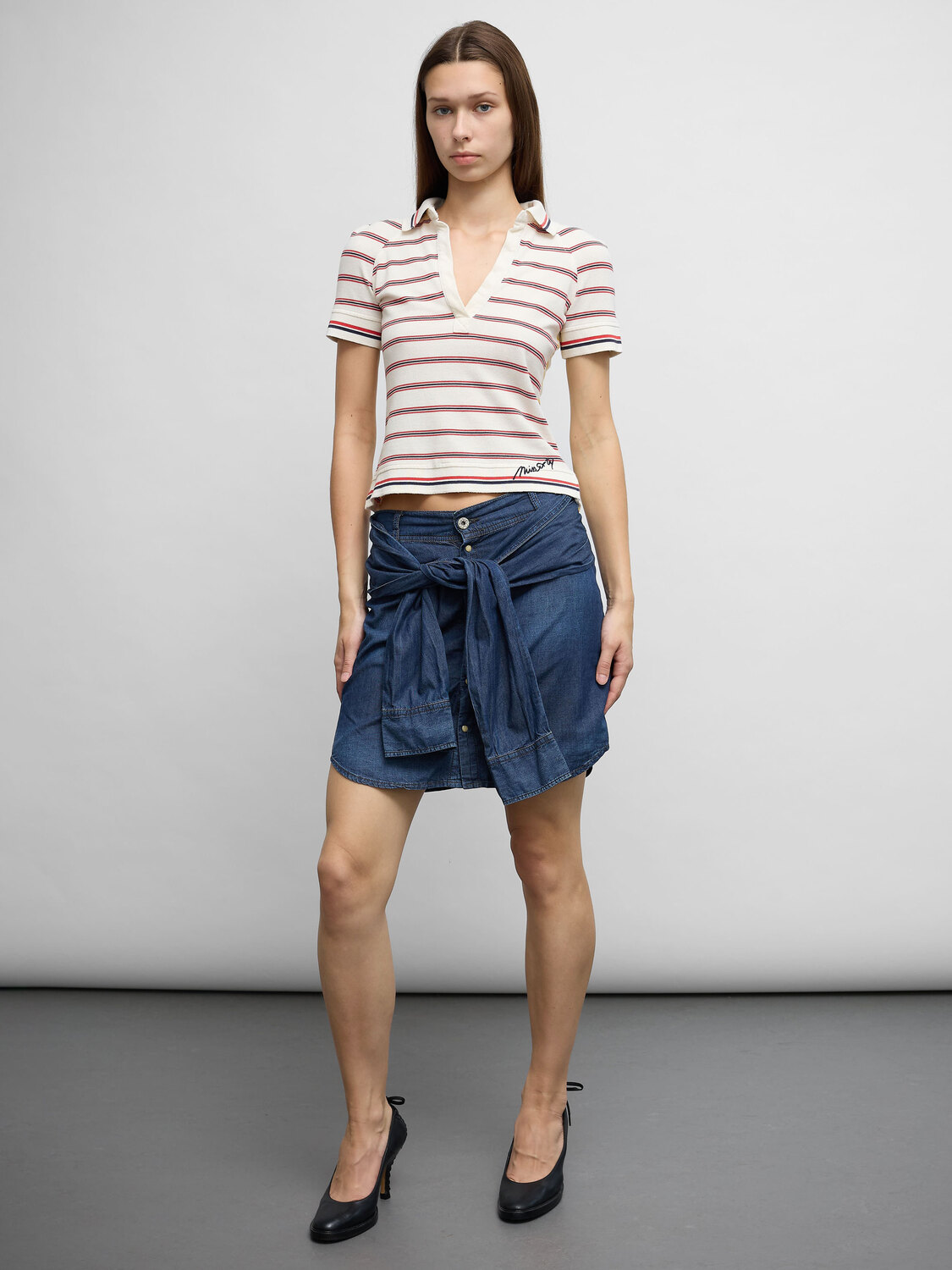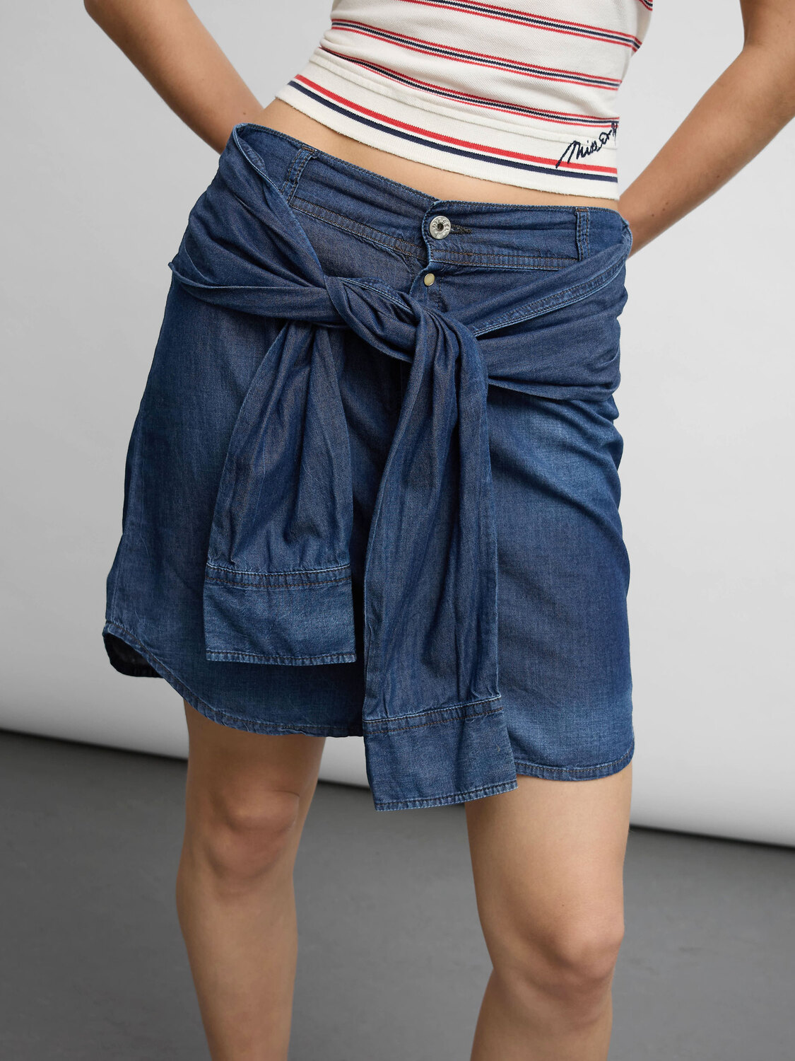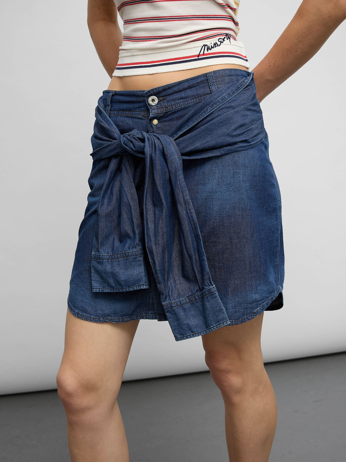 Diesel navy blue denim deconstructed shirt-skirt with decorative sleeves at the waist that tie up as a belt, pearl snap buttons and belt loops.