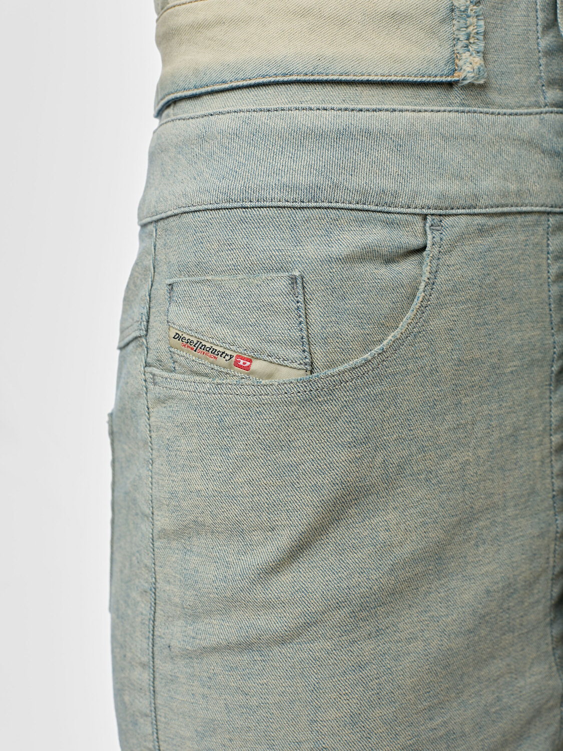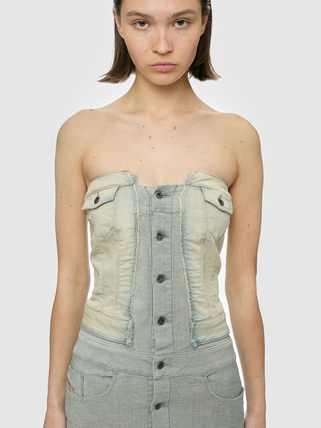 Diesel stretchy denim deconstructed strapless bustier button up mini dress with multiple pockets.