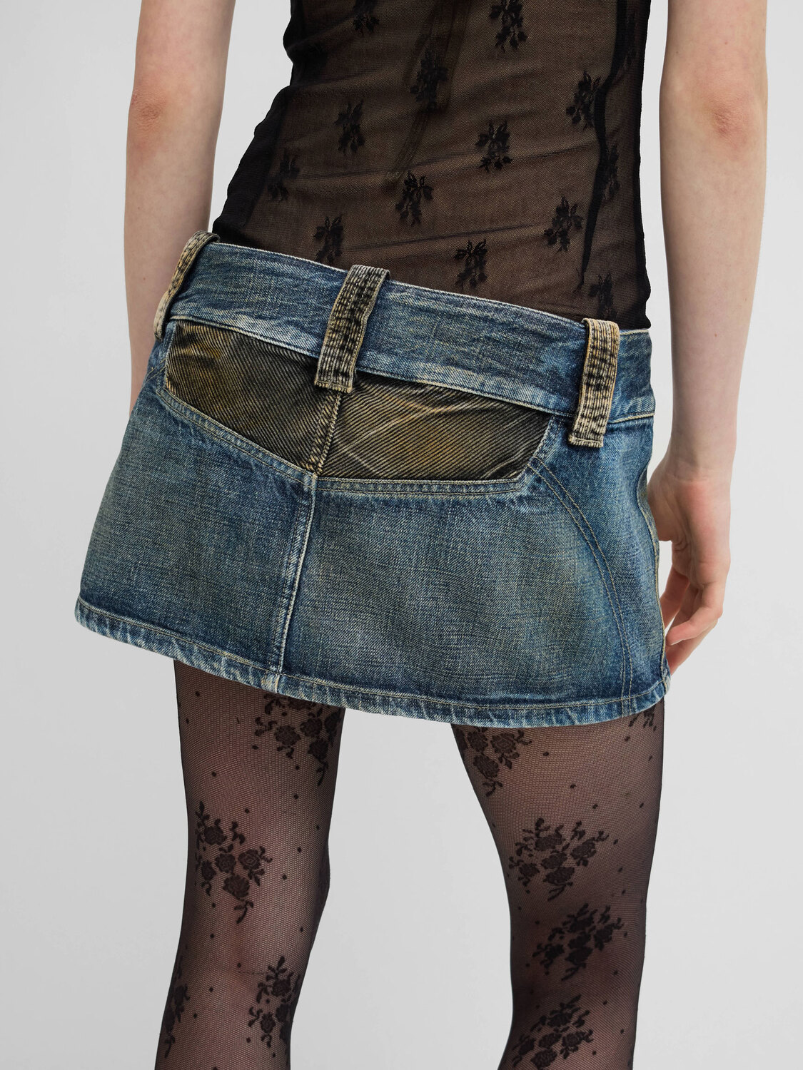 Diesel light blue denim low rise mini skirt. Grey corduroy belt loops. Belt detail with snap buttons. Dirt-effect stripes at the front. Grey corduroy panel at the back.