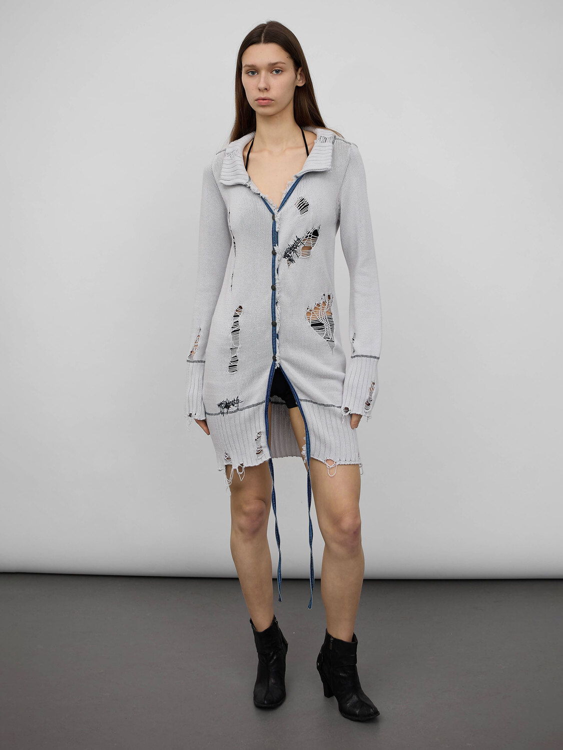 Diesel light grey distressed effect knitted long cardigan with snap button closure and blue denim trim.