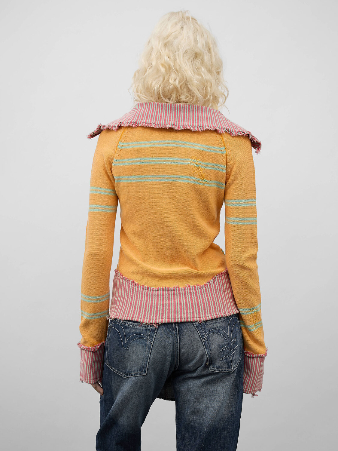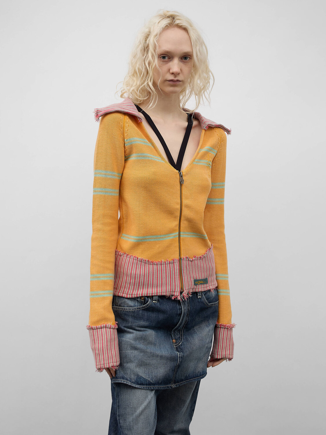 Diesel orange cotton knitted distressed effect zip-up cardigan with turquoise stripes and pink raw finish striped patchwork collar and hem.