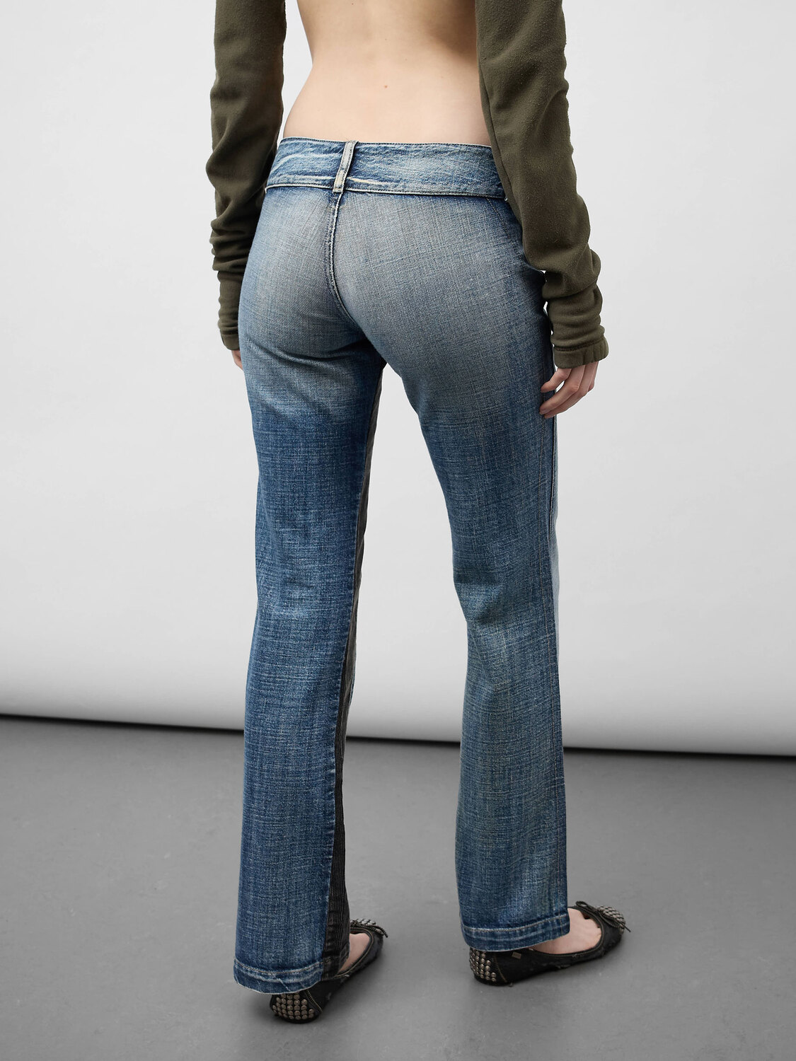 Diesel blue deconstructed washed effect low-waist jeans with grey corduroy inner leg sections, belt loops, zipper and button fly closure.