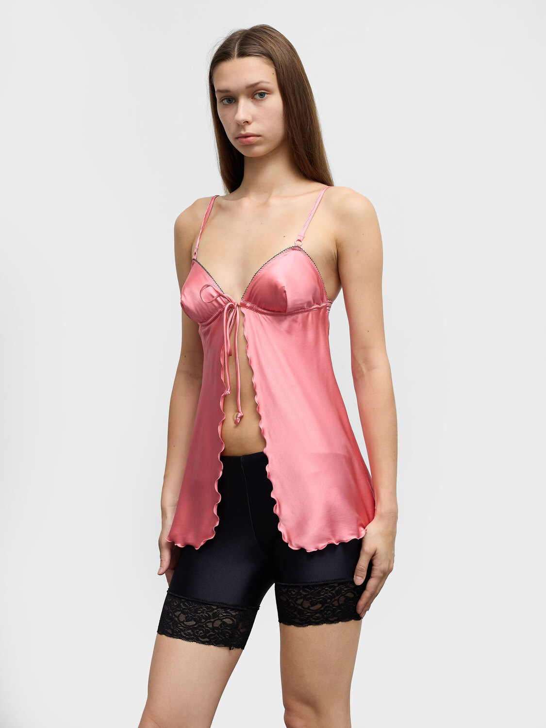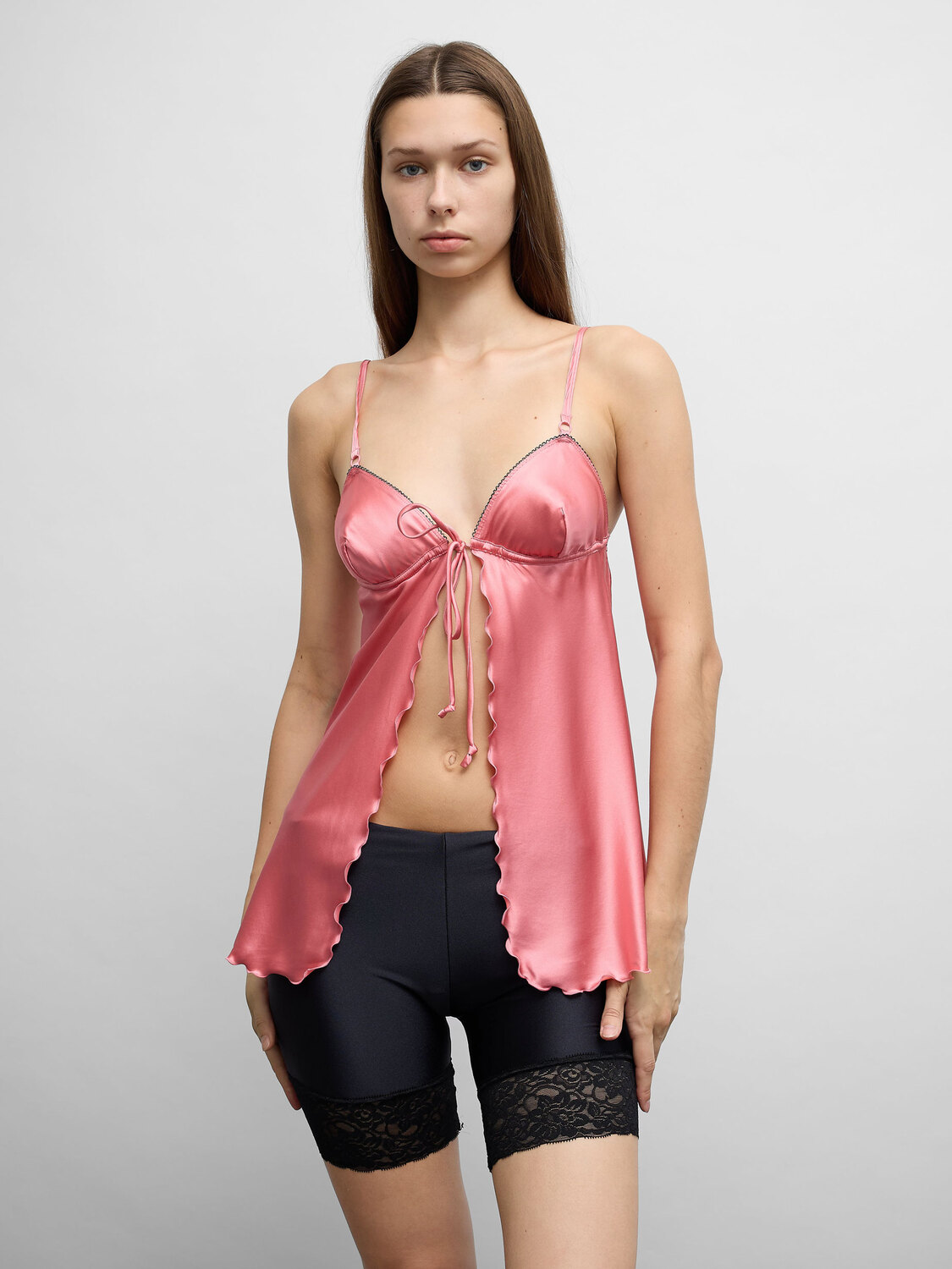 Diesel pink stretchy silk camisole top with open front and tie closure. Logo elastic band at the back. Adjustable straps. Lettuce hem.