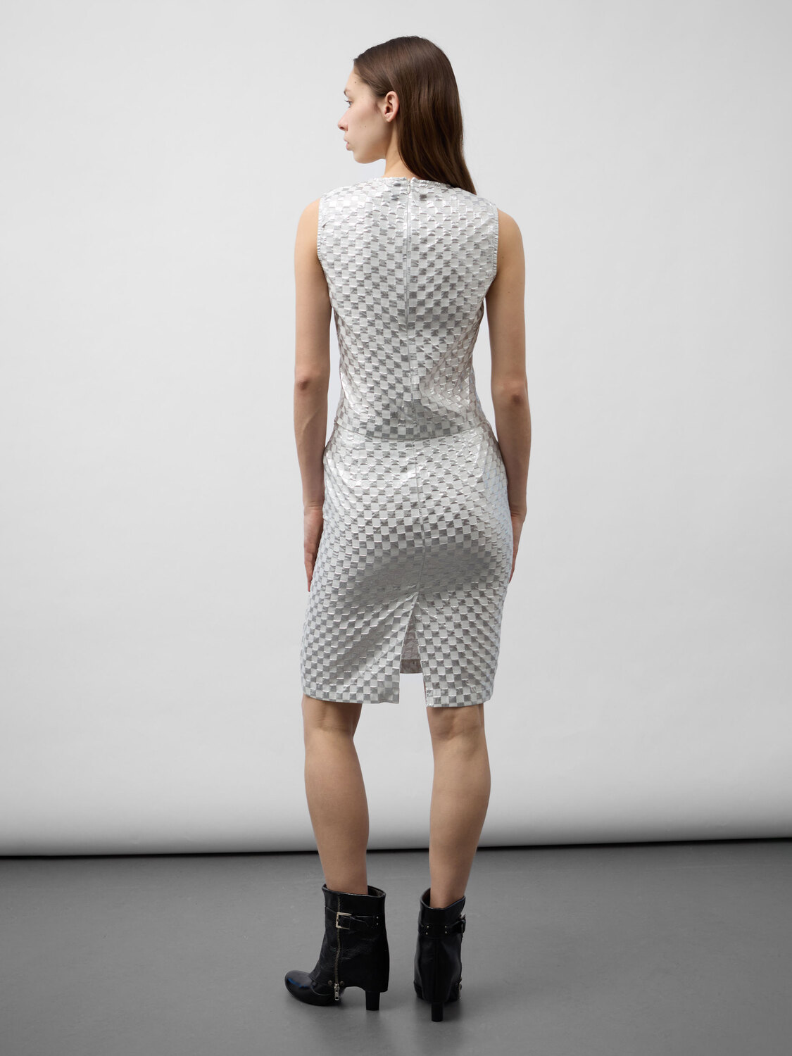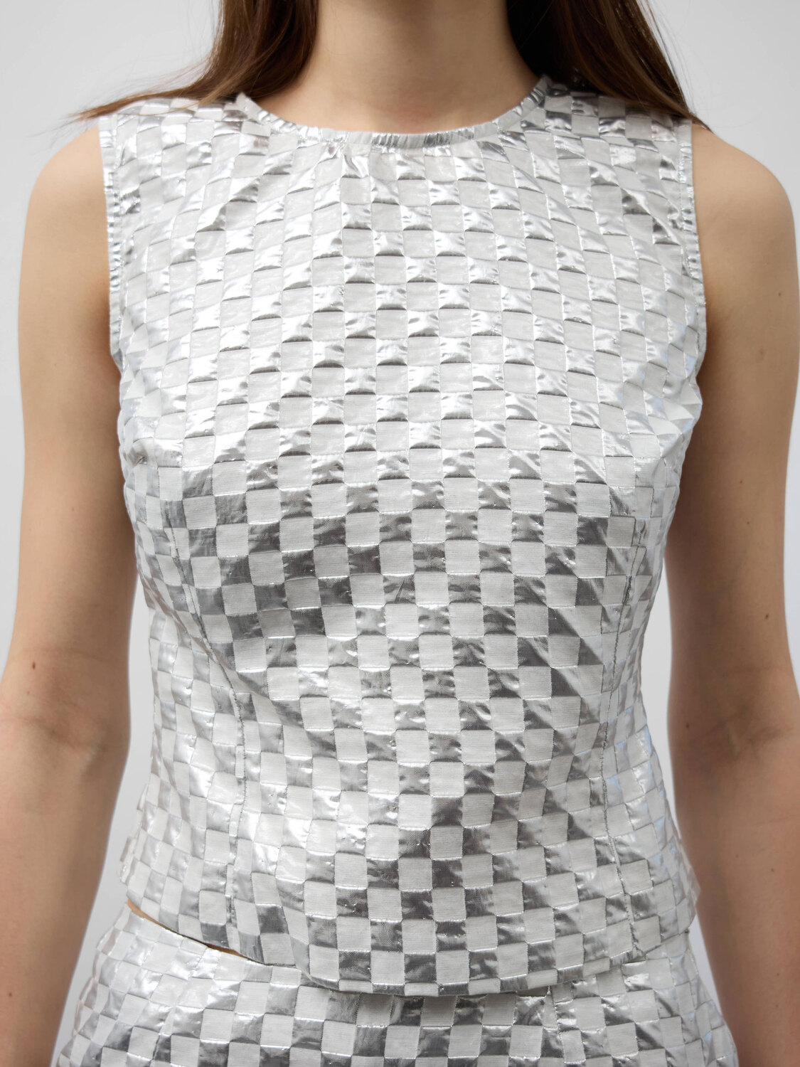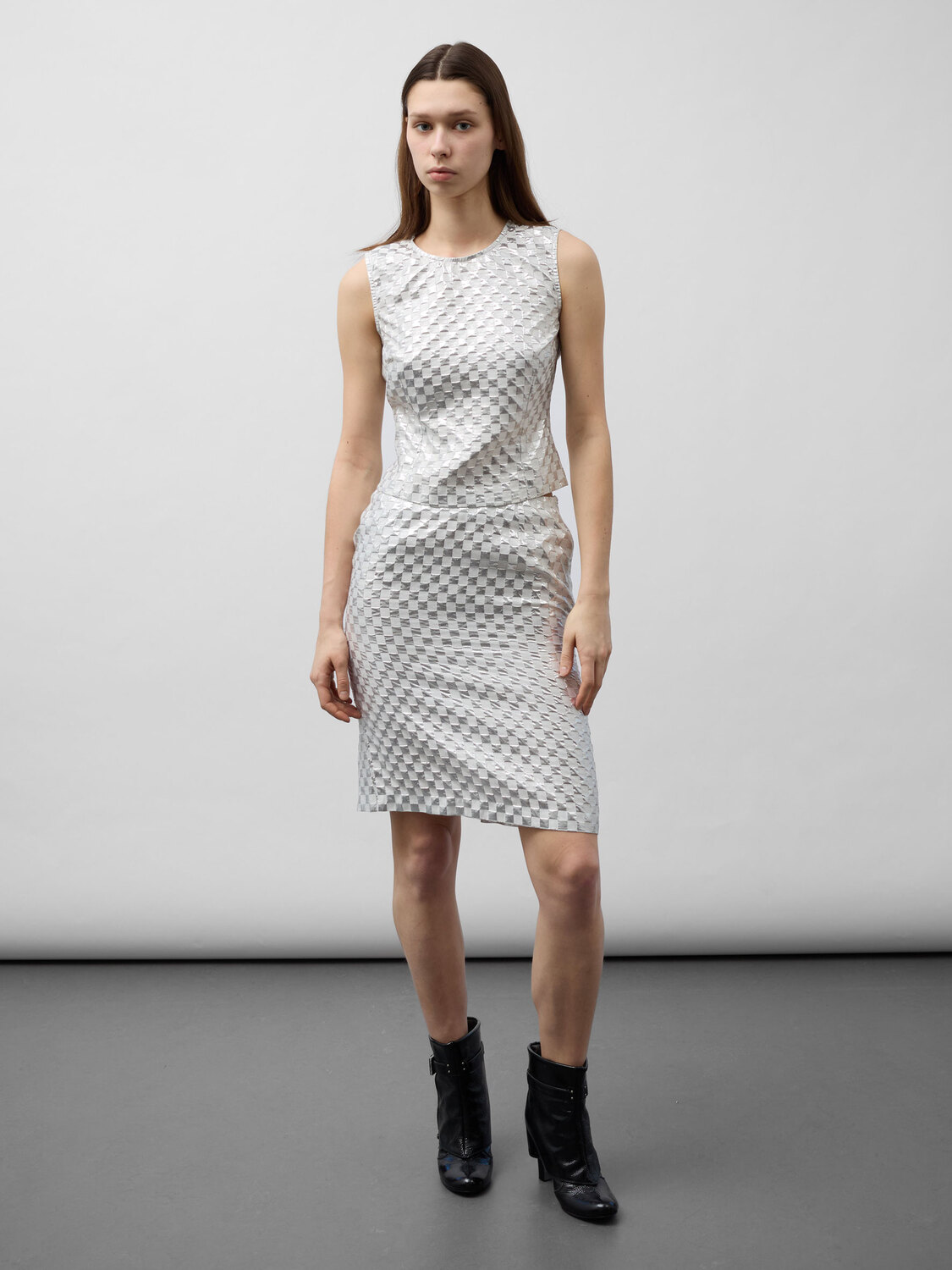 E-Play white and glittery silver checkered set. Midi skirt with a small split at the rear hem. Sleeveless top. Concealed zipper closure on both articles.